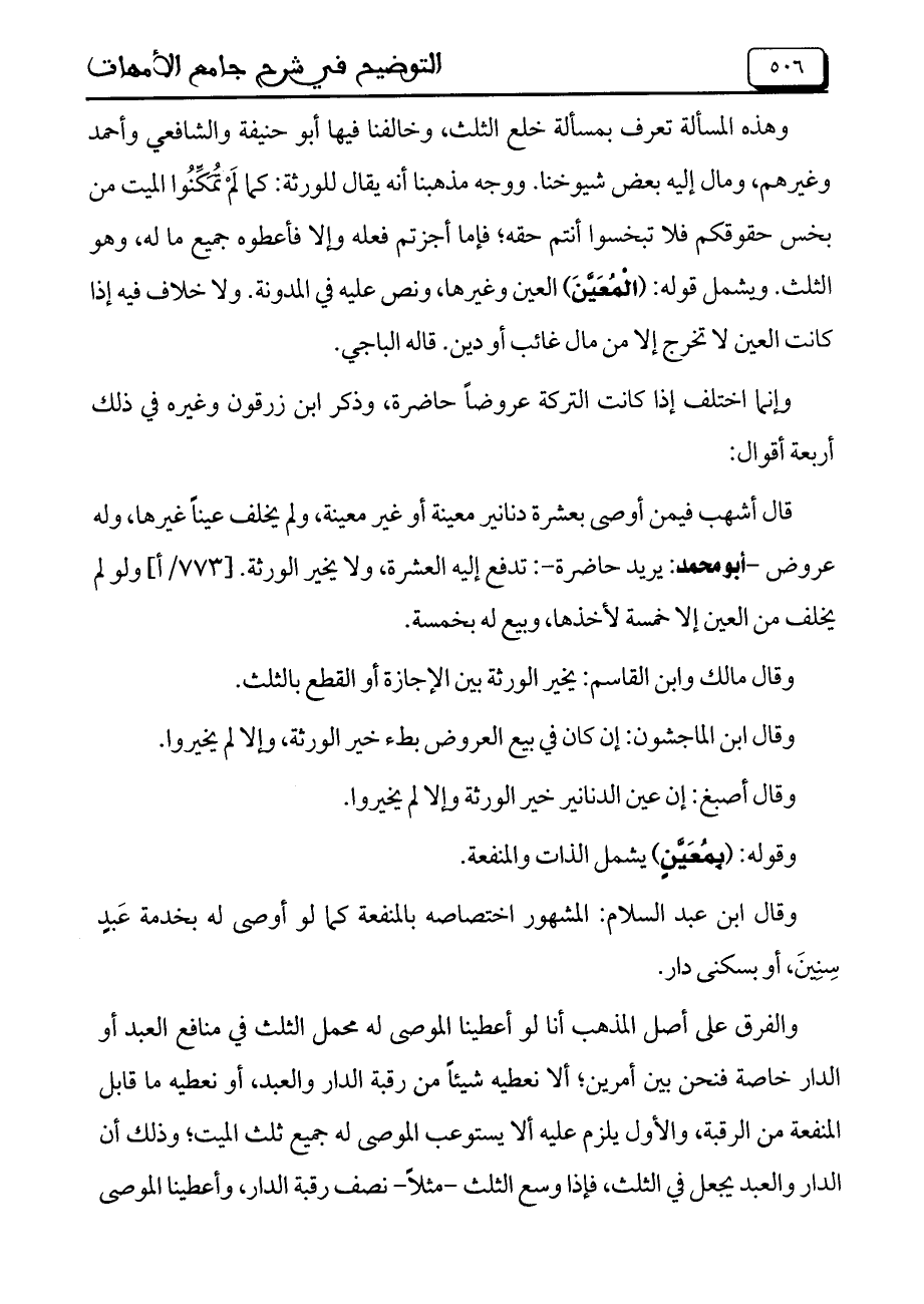 وهذه المسألة تعرف بمسألة خلع الثلث، وخالفنا فيها أبو حنيفة والشافعي وأحمد وغيرهم، ومال إليه بعض شيوخنا. ووجه مذهبنا أنه يقال للورثة: كما لَمْ تُمكَّنُوا الميت من بخس حقوقكم فلا تبخسوا أنتم حقه؛ فإما أجزتم فعله وإلا فأعطوه جميع ما له، وهو الثلث. ويشمل قوله: (الْمُعَيَّنَ) الين وغيرها، ونص عليه في المدونة. ولا خلاف فيه إذا كانت العين لا تخرج إلا من مال غائب أو دين. قاله الباجي.
