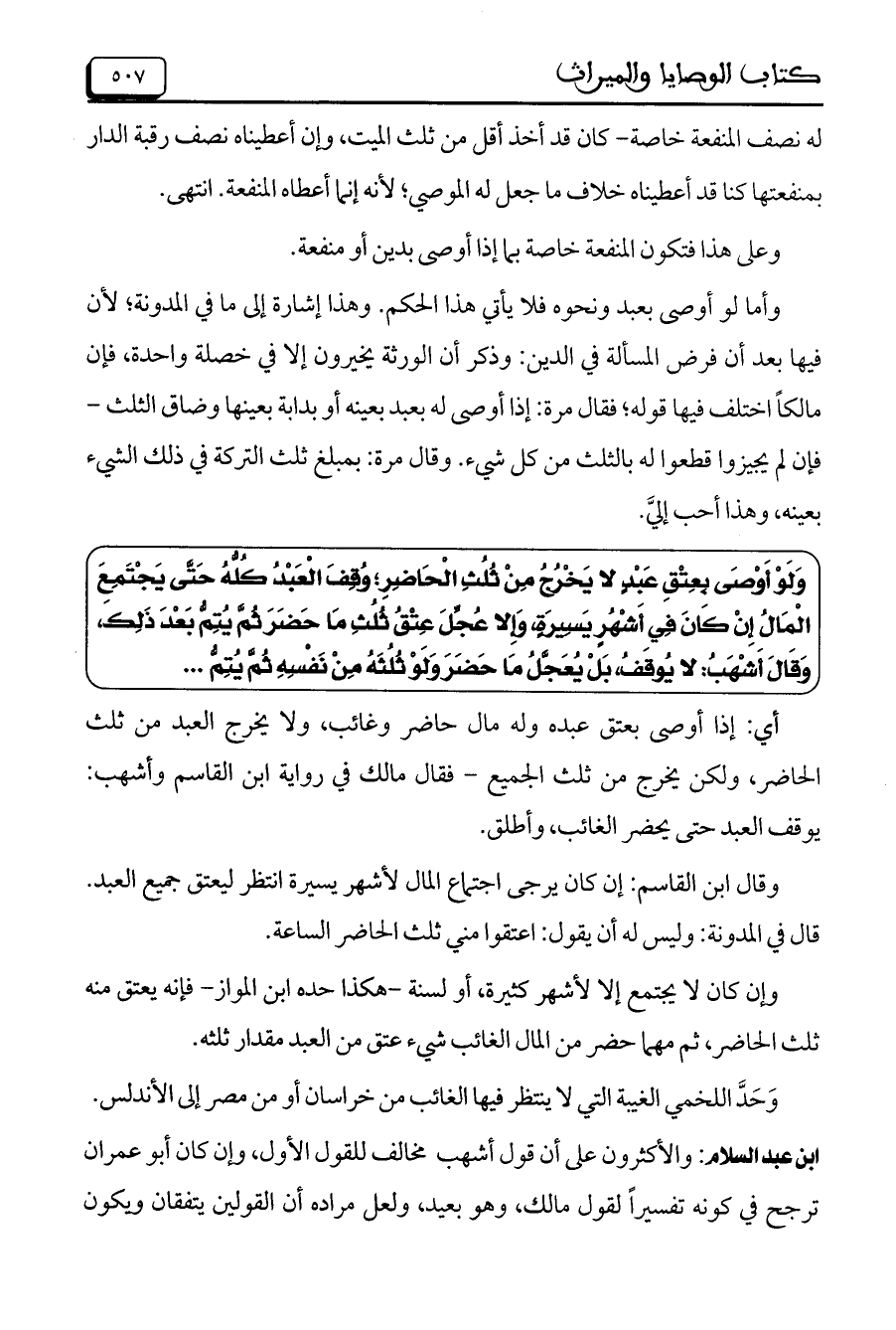 وَلَوْ أَوْصَى بعِتْقِ عَبْدٍ لايَخْرُجُ مِنْ ثُلُثِ الْحَاضِرِ؛ وُقِفَ الْعَبْدُ كُلُّهُ حَتَّى يَجْتَمِعَ الْمَالُ إِنْ كَانَ فِي أَشْهُرٍ يَسِيرَةٍ وَإِلا عُجِّلَ عِتْقُ ثُلُثِ مَا حَضَرَ ثُمَّ يُتِمُّ بَعْدَ ذَلِكَ، وَقَالَ أَشْهَبُ؛ لا يُوقَفُ، بَلْ يُعَجِّلُ مَا حَضَرَ وَلَوْ ثُلُثَهُ مِنْ نَفْسِهِ ثُمَّ يُتِمُّ ...