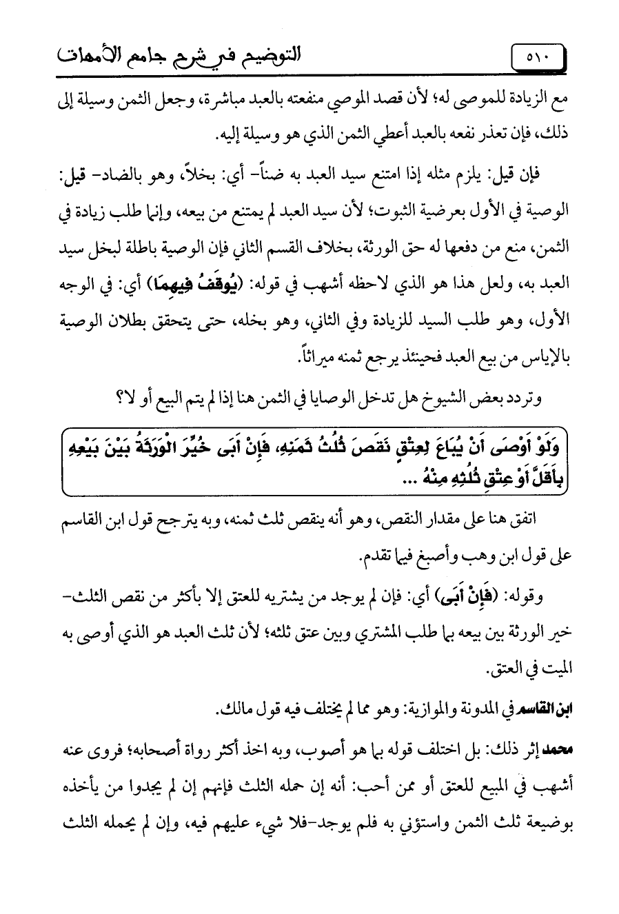 فإن قيل: يلزم مثله إذا امتنع سيد العبد به ضناً-أي: بخلاً، وهو بالضاد- قيل: الوصية في الأول بعرضية الثبوت؛ لأن يد العبد لم يمتنع من بيعه، وإنما طلب زيادة في الثمن، منع من دفعها له حق الورثة، بخلاف القسم الثاني فإن الوصية باطلة لبخل سيد العبد بهن ولعل هذا هو الذي لاحظه أشهب في قوله: (يُوقَفُ فِيهِمَا) أي: في الوجه الأول، وهو طلب السيد للزيادة وفي الثاني، وهو بخله، حتى يتحقق بطلان الوصية بالإياس من بيع العبد فحينئذ يرجع ثمنه ميراثاً.