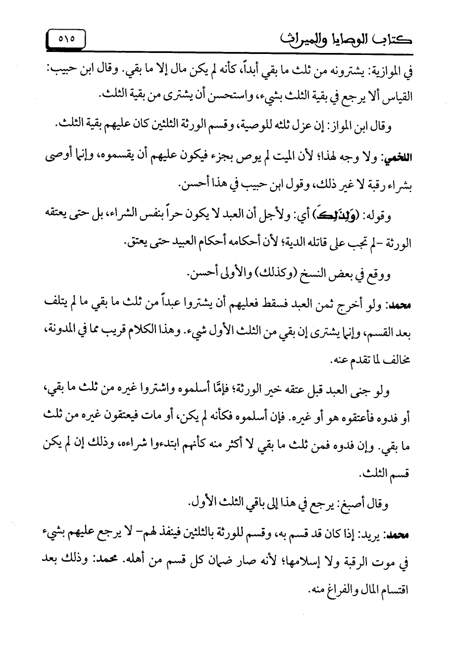 محمد: يريد: إذا كان قد قسم به، وقسم للورثة بالثلثين ينفذ لهم- لا يرجع عليهم بشيء في موت الرقبة ولا إسلامها؛ لأنه صار ضمان كل قسم من أهله. محمد: وذلك بعد اقتسام المال والفراغ منه.
