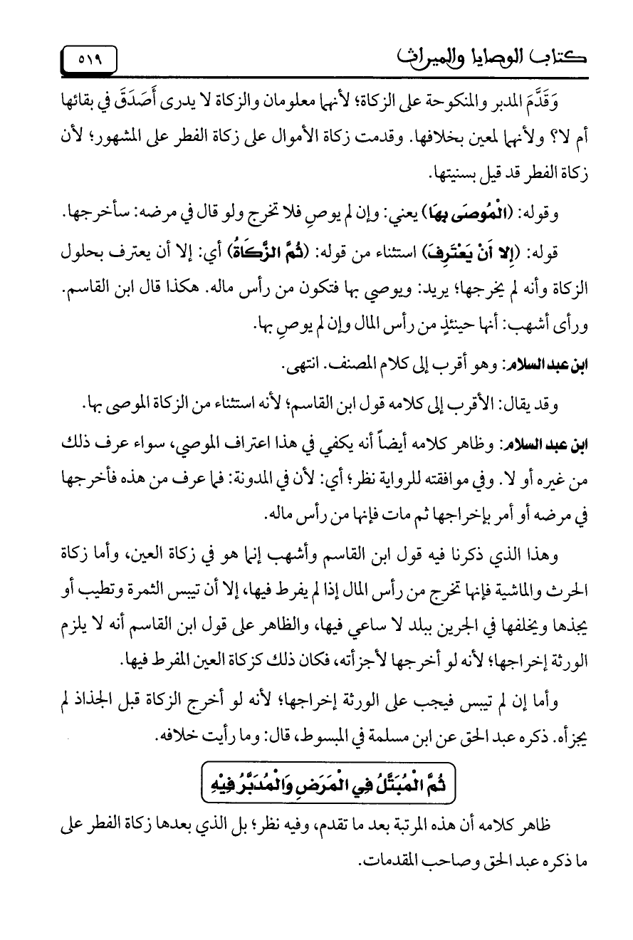 وقد يقال: الأقرب إلى كلامه قول ابن القاسم؛ لأنه استثناء من الزكاة الموصى بها.