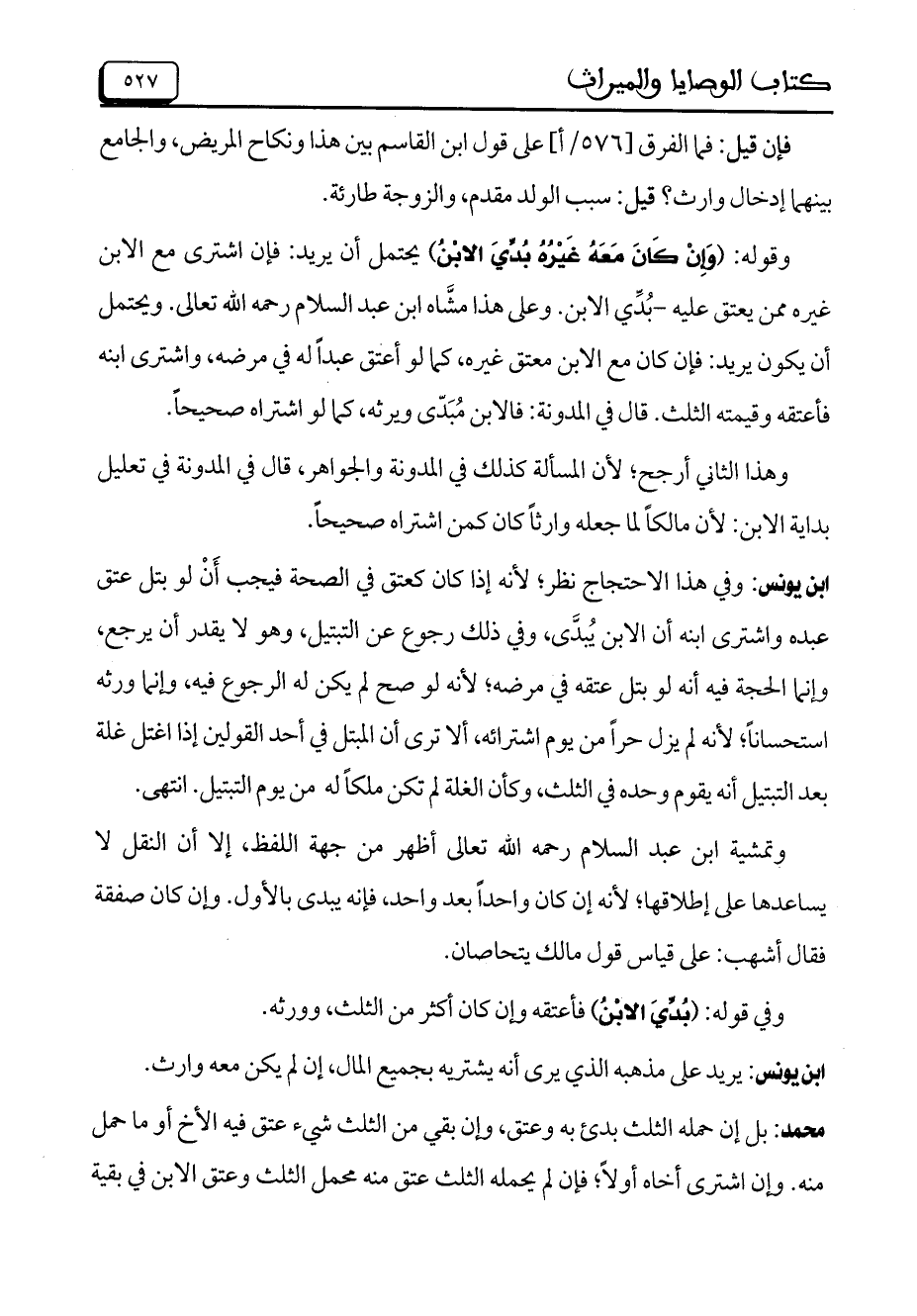وهذا الثاني أرجح؛ لأن المسألة كذلك في المدونة والجواهر، قال في المدونة في تعليل بداية الابن: لأن مالكاً لما جعله وارثاً كان كمن اشتراه صحيحاً.