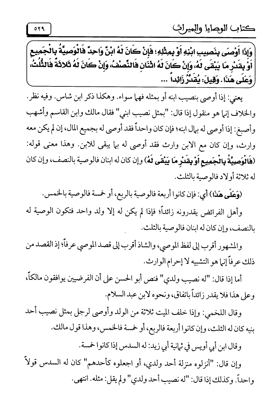 يعني: إذا أوصى بنصيب ابنه أو بمثله فهما سواء. وهكذا ذكر ابن شاس. وفيه نظر. والخلاف إنما هو منقول إذا قال: "بمثل نصيب ابني" فقال مالك وابن القاسم وأشهب وأصبغ: إذا أوصى له بمال ابنه؛ فإن كان واحداً فقد أوصى له بجميع المال، إن لم يكن معه وارث، وإن كان مع الابن وارث فقد اوصى له بما يبقى للابن. وهذا معنى قوله: (فَالْوَصِيَّةُ بالْجَمِيعِ أَوْ بقَدْرِ مَا يَبْقَى لَهُ، وَإِنْ كَانَ لَهُ) وإن كان له ابنان فالوصية بالنصف، وإن كان له ثلاثة أولاد فالوصية بالثلث.