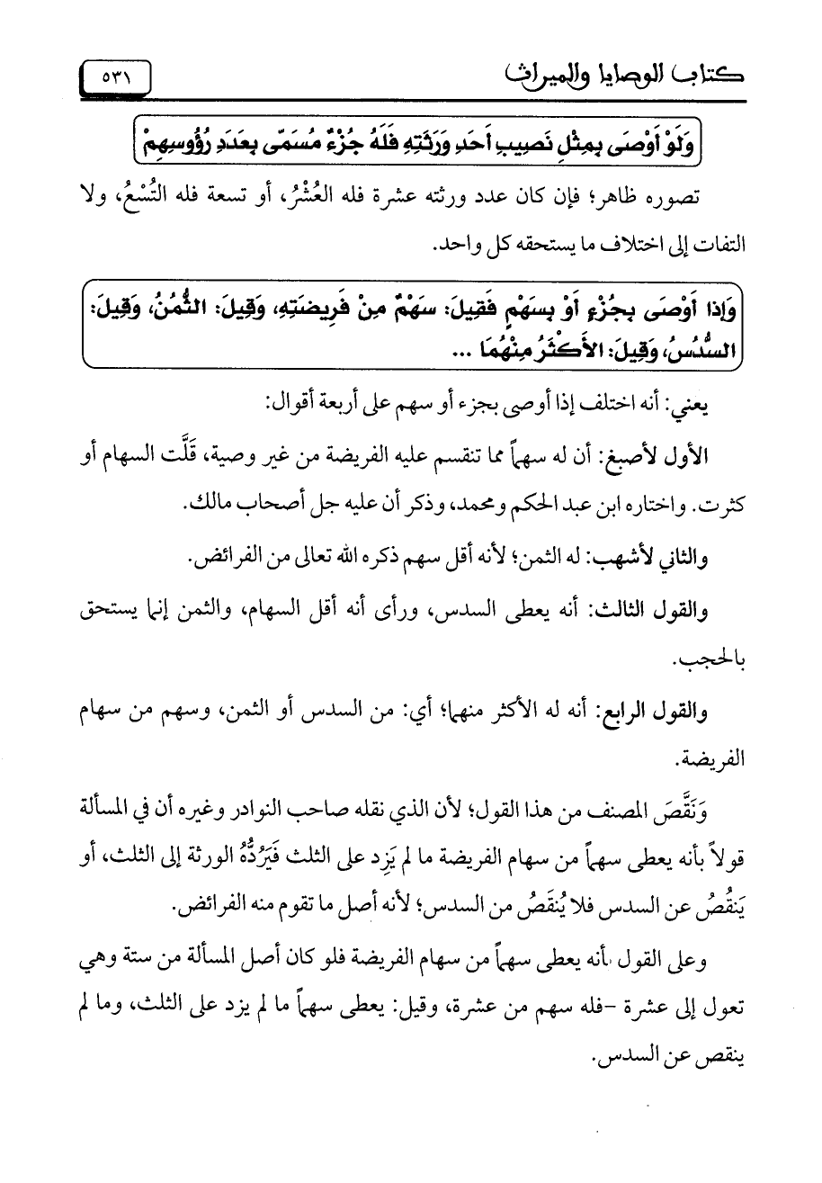 وَإِذَا أَوْصَى بجُزْءٍ أَوْ بسَهْمٍ فَقِيلَ: سَهْمٌ مِنْ فَرِيضَتِهِ، وَقِيلَ: الثُّمُنُ، وَقِيلَ: السُّدُسُ، وَقِيلَ: الأَكْثَرُ مِنْهُمَا ...