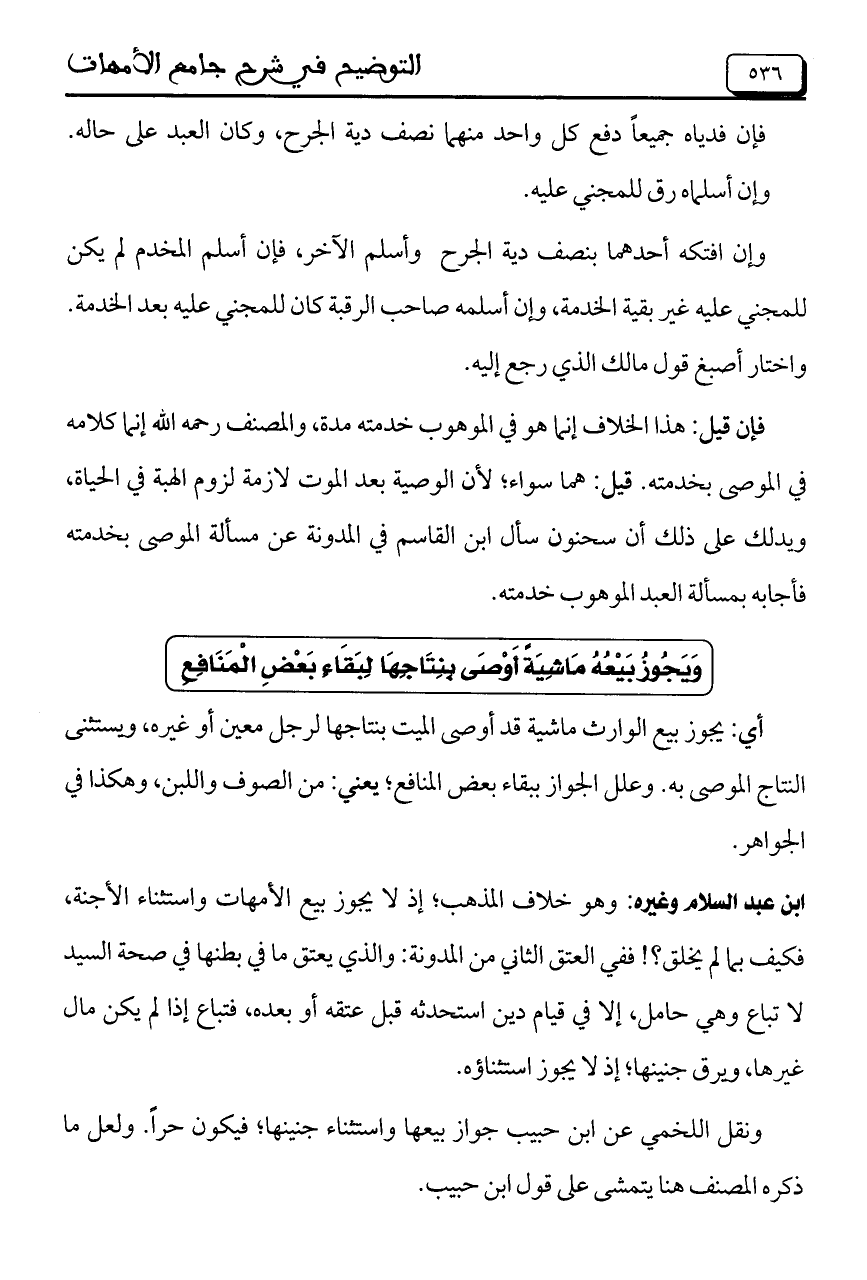 ابن عبد السلام وغيره: وهو خلاف المذهب؛ إذ لا يجوزبيع الأمهات واستثناء الأجنة، فكيف بما لم يخلق؟ ّ ففي العتق الثاني من المدونة: والذي يعتق مافي بطنها في صحة السيد لا تباع وهي حامل، إلا في قيام دين استحدثه قبل عتقه أو بعده، فتباع إذا لم يكن مال غيرها، ويرق جنينها؛ إذ لا يجوز استثناؤه.