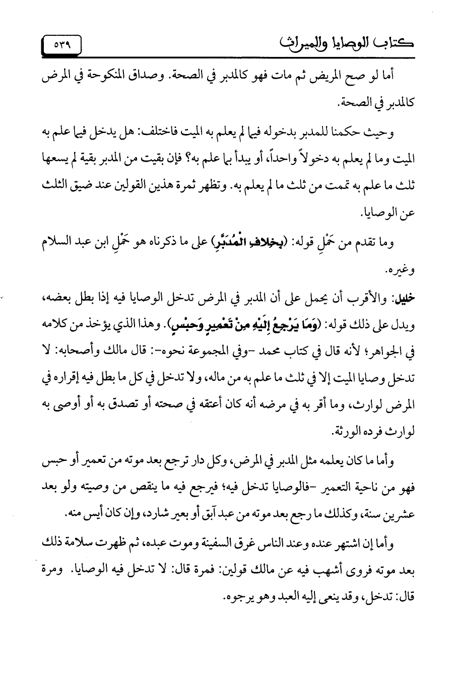 خليل: والأقرب أن يحمل على أن المدبر في المرض تدخل الوصايا فيه إذا بطل بعضه، ويدل على ذلك قوله (وَمَا يَرْجَعُ إِلَيْهِ مِنْ تَعْمِيرٍ وَحَبْسٍ). وهذا الذي يؤخذ من كلامه في الجواهر؛ لأنه قال في كتاب محمد- وفي المجموعة نحوه-: قال مالك وأصحابه: لا تدخل وصايا الميت لا في ثلث ما علم به من ماله، ولا تدخل في كل ما بطل فيه إقراره في المرض لوارث، وما أقر به في مرضه أنه كان أعتقه في صحته أو تصدق به أو أوصى به لوارث فرده الورثة.