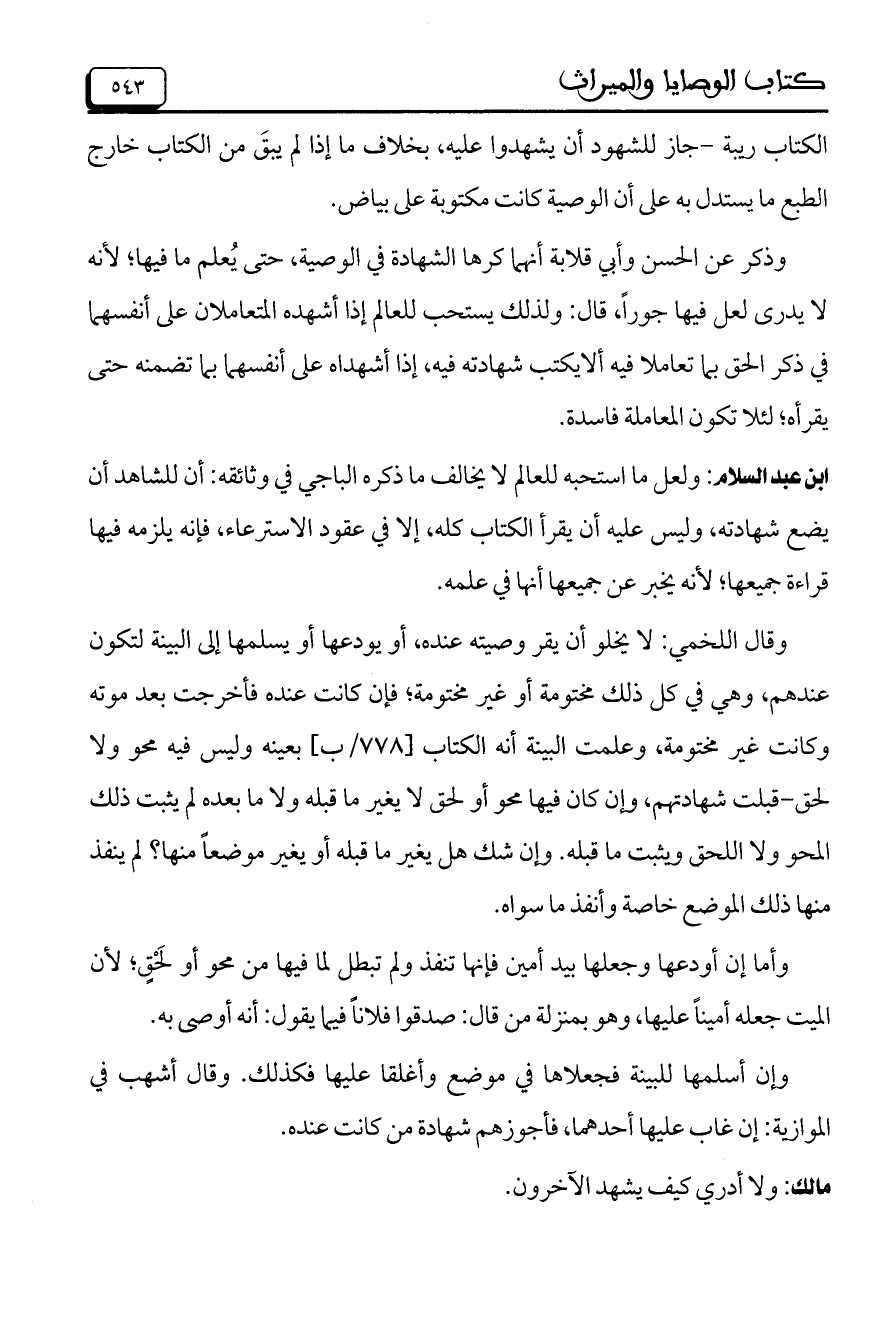 ابن عبد السلام: ولعل ما استحبه للعالم لا يخالف ما ذكره الباجي في وثائقه: أن للشاهد أن يضع شهادته، وليس عليه أن يقرأ الكتاب كله، إلا في عقود الاسترعاء، فإنه يلزمه فيها قراءة جميعها؛ لأنه يخبر عن جميعها أنها في علمه.