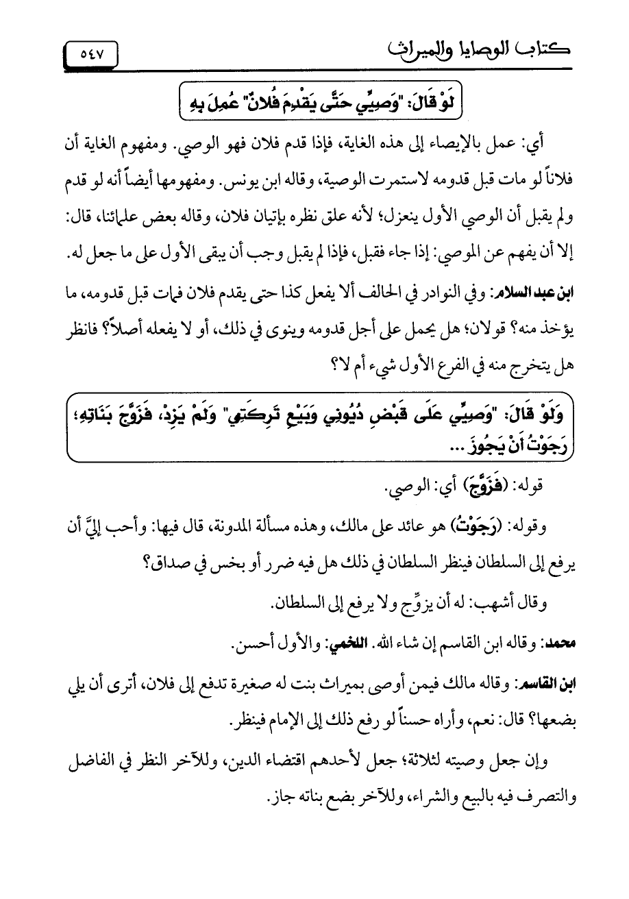 ابن القاسم: وقاله مالك فيمن أوصى بميراث بنت له صغيرة تدفع إلى فلان، أترى أن يلي بضعها؟ قال: نعم، وأراه حسناً لو رفع ذلك إلى الإمام فينظر.