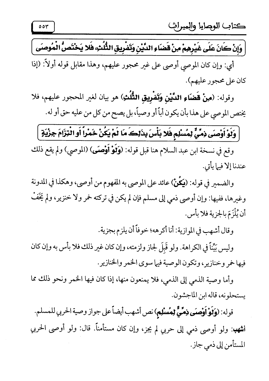 وَلَوْ أَوْصَى ذِمِّيٌّ لِمُسْلِمٍ فَلا بَاسَ بذَلِكَ مَا لَمْ يَكُنْ خَمْراً أَو الْتِزَامَ جِزْيَةٍ