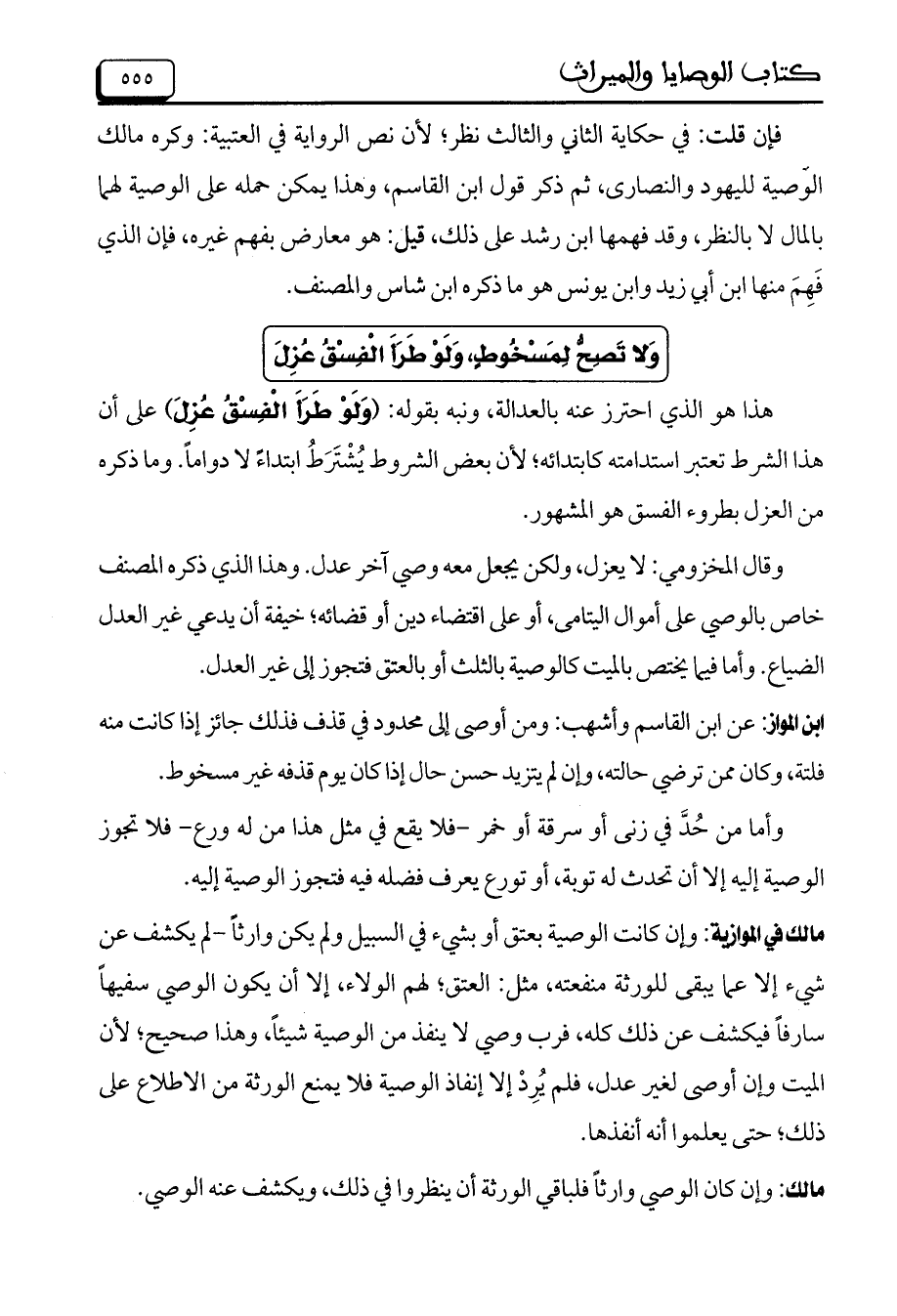 فإن قلت: في حكاية الثاني والثالث نظر؛ لأن نص الرواية في العتبية: وكره مالك الوصية لليهود والنصارى، ثم ذكرقول ابن القاسم، وهذا يمكن حمله على الوصية لهما بالمال لا بالنظر، وقد فهمها ابن رشد على ذلك، قيل: هو معارض بفهم غيره، فإن الذي فَهِمَ منها ابن أبي زيد وابنيونس هو ما ذكره ابن شاس والمصنف.