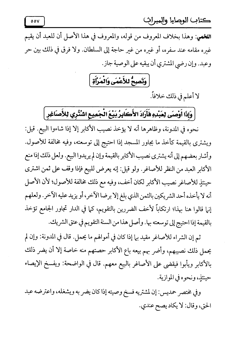 نحوه في المدونة، وظاهرها أنه لا يؤخذ نصيب الأكابر إلا إذا شاءوا البيع. قيل: ويشترى بالقيمة كاخذ ما يجاور المسجد إذا احتيج إلى توسعته، وفيه مخالفة للأصول. وأشار بعضهم إلى أنه يشترى نصيب الأكابر بالقيمة إن لم يريدوا البيع. ولعل ذلك إذا منع الأكابر العبد من النظر للأصاغر. ولو قيل: إنه يعرض للبيع فإذا وقف على ثمن اشترى حينئذٍ للأصاغر نصيب الأكابر لكان أخف، وفيه مع ذلك مخالفة للأصول؛ لأن الأصل أنه لا يأخذه أحد الشريكين بالثمن الذي بلغ إلا برضا الآخر، أو يزيد عليه الآخر. ولعلهم إنما قالوا هنا بهذا؛ ارتكاباً لأخف الضررين بالتقويم، كما في الدار تجاور الجامع تؤخذ بالقيمة إذا احتيج إلى توسعته بها. وأصل هذا من السنة التقويم في عتق الشريك.