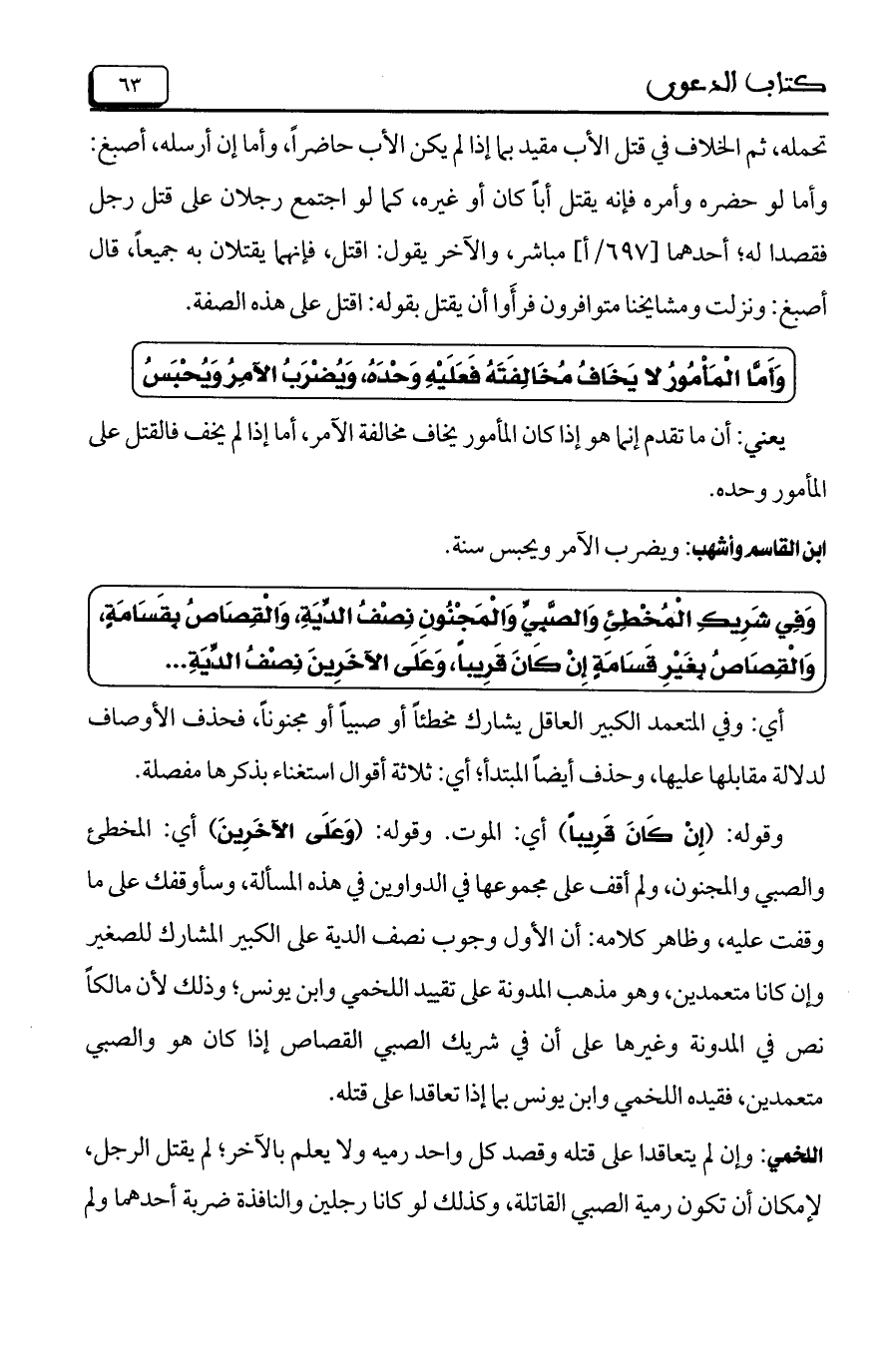 وقوله: (إِنْ كَانَ قَرِيباً) أي: الموت. وقوله: (وَعَلَى الآخَرِينَ) أي: المخطئ والصبي والجنون، ولم أقف على مجموعها في الدواوين في هذه المسألة وسأوقفك على ما وقفت عليه، وظاهر كلامه: أن الأول وجوب نصف الدية على الكبير المشارك للصغير وإن كانا متعمدين، وهو مذهب المدونة على تقييد اللخمي وابن يونس؛ وذلك لأن مالكاً نص في المدونة وغيرها على أن في شريك الصبي القصاص إذا كان هو والصبي متعمدين، فقيده اللخمي وابن يونس بما إذا تعاقدا على قتله.
