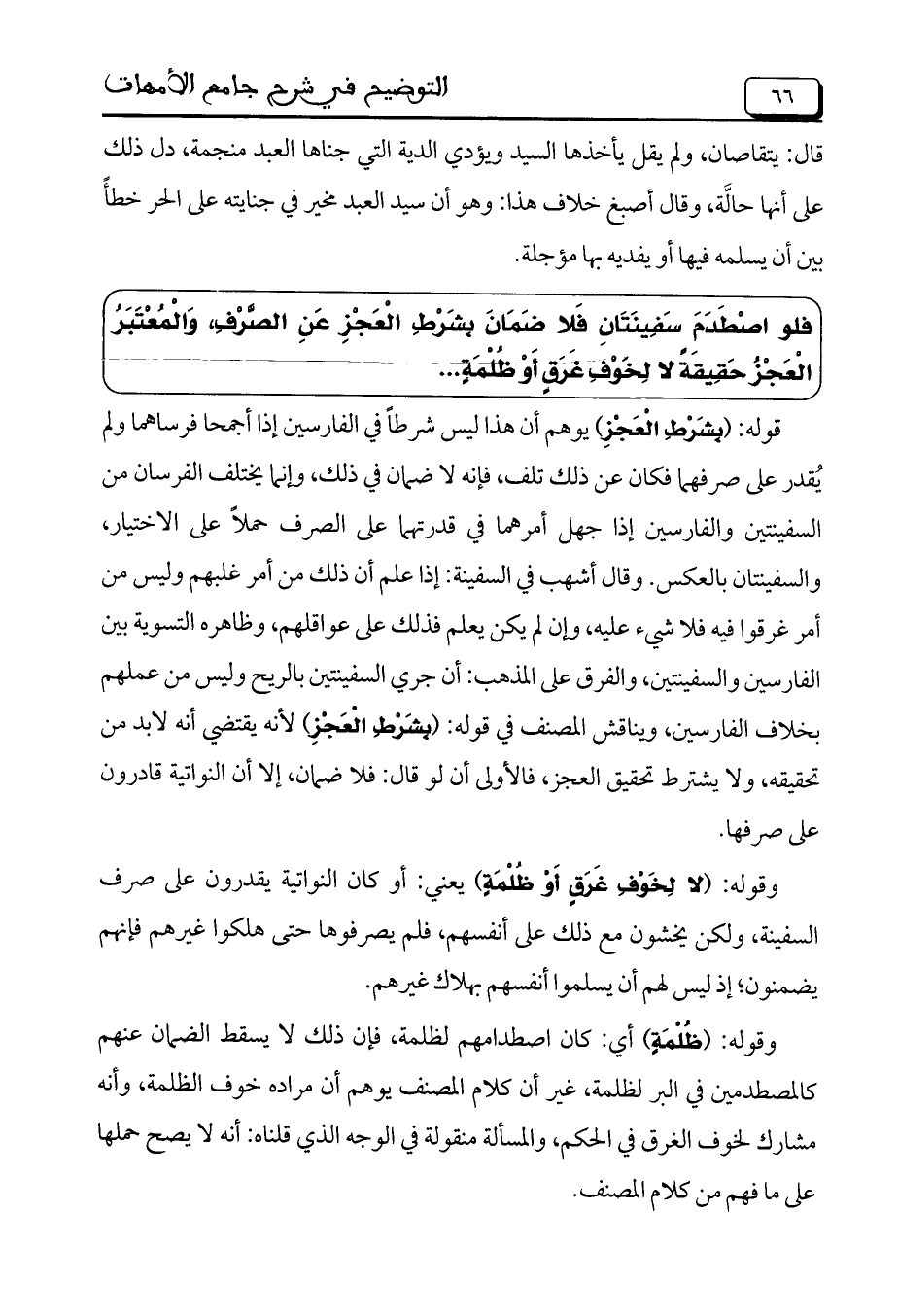 فلو اصْطَدَمَ سَفِينَتَانِ فَلا ضَمَانَ بشَرْطِ الْعَجْزِ عَنِ الصَّرفِ، وَالْمُعْتَبَرُ الْعَجْزُ حَقِيقَةٌ لا لِخَوْفِ غَرَقٍ أَوْ ظُلْمَةٍ ...