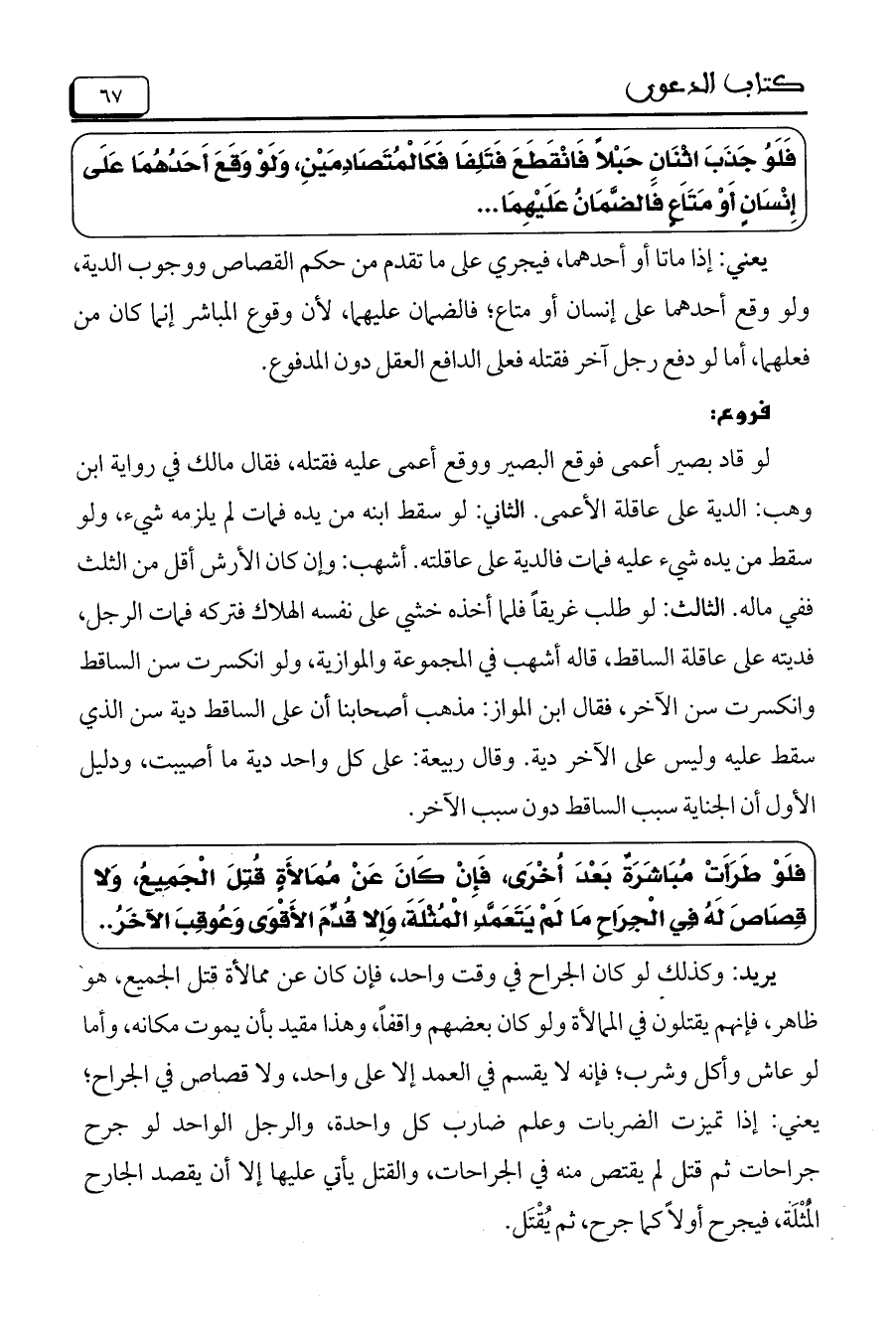 لو قاد بصير أعمى فوقع البصير ووقع أعمى عليه فقتله، فقال مالك في رواية ابن وهب: الدية على عاقلة الأعمى. الثاني: لو سقط ابنه من يده فمات لم يلزمه شيء، ولو سقط من يده شيء عليه فمات فالدية على عاقلته. أشهب: وإن كان الأرش أقل من الثلث ففي ماله. الثالث: لو طلب غريقاً فلما أخذه خشي على نفسه الهلاك فتركه فمات الرجل، فديته على عاقلة الساقط، قاله أشهب في المجموعة والموازية، ولو انكسرت سن الساقط وانكسرت سن الآخر، فقال ابن المواز: مذهب أصحابنا أن على الساقط دية سن الذي سقط عليه وليس على الآخر دية. وقال ربيعة: على كل واحد دية ما أصيبت، ودليل الأول أن الجناية سبب الساقط دون سبب الآخر.