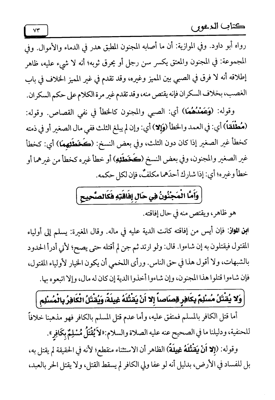 رواه أبو داود. وفي الموازية: أن ما أصابه المجنون المطبق هدر في الدماء والأموال. وفي المجموعة: في المجنون والمعتق يكسر سن رجل أو يحرق ثوبه؛ أنه لا شيء عليه، ظاهر إطلاقه أنه لا فرق في الصبي بين المميز وغيره، وقد تقدم في غير المميز الخلاف في باب الغصب، بخلاف السكران فإنه يقتص منه، وقد تقدم غير مرة الكلام على حكم السكران.