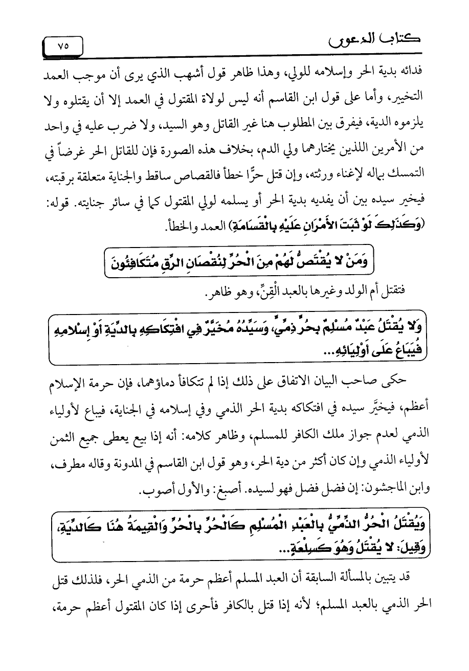 وَلا يُقْتَلُ عَبْدٌ مُسْلِمٌ بَحُرٍّ ذِمِّيٍّ، وَسَيِّدُهُ مُخَيَّرٌ فِي افْتِكَاكِهِ بالدِّيَةِ أَوْ إسْلامِهِ فَيُبَاعُ عَلَى أَوْلِيَائِهِ ...