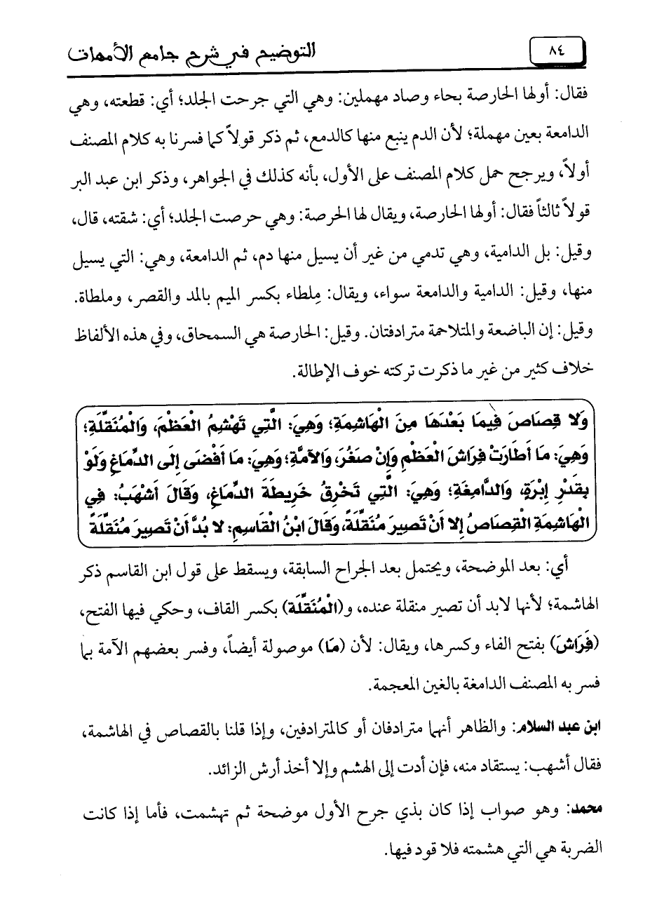 ابن عبد السلام: والظاهر أنهما مترادفان أو كالمترادفين، وإذا قلنا بالقصاص في الهاشمة، فقال أشهب: يستفاد منه، فإن أدت إلى الهشم وإلا أخذ أرش الزائد.