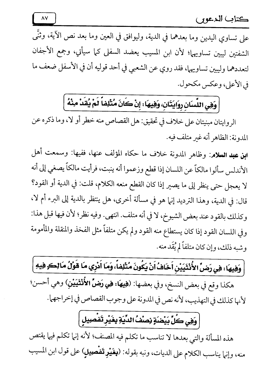 ابن عبد السلام: وظاهر المدونة خلاف ما حكاه المؤلف عنها، ففيها: وسمعت أهل الأندلس سألوا مالكاً عن اللسان إذا قطع وزعموا أنه ينبت، فرأيت مالكاً يصغي إلى أنه لا يعجل حتى ينظر إلى ما يصير إذا كان القطع منعه الكلام، قلت: في الدية أو القود؟ قال: في الدية، وهذا الترديد إنما هو في مسألة أخرى، هل ينتظر بالدية إلى البرء أم لا، وكذلك بالقود عند بعض الشيوخ، لا في أنه متلف. انتهى. وفيه نظر؛ لأن فيها قبل هذا: وفي اللسان القود إذا كان يستطاع منه القود ولم ينك متلفاً مثل الفخذ والمنقلة والمأمومة وشبه ذلك، وإن كان متلفاً لم يُقَد منه.