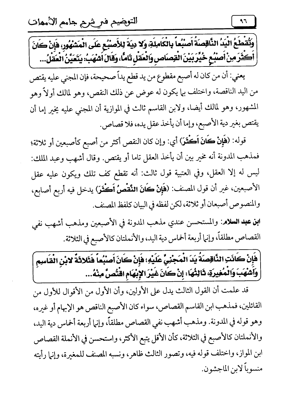 ابن عبد السلام: والمستحسن عندي مذهب المدونة في الأصبعين ومذهب أشهب نفي القصاص مطلقاً، وإنما أربعة أخماس دية اليد، والأنملتان كالأصبع في الثلاثة.