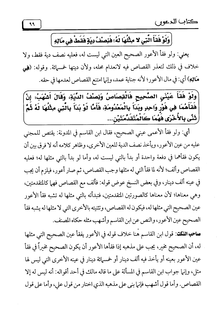 صاحب النكت: قول ابن القاسم هنا خلاف قوله في الأعور يفقأ عين الصحيح التي مثلها له، أن الصحيح مخير، يجب على مذهبه إذا فقأها الأعور أن يكون الصحيح مخيراً في فقأ عين الأعور بعينه أو يأخذ فيه ألف دينار أو خمسمائة دينار في عينه الأخرى التي ليس لها مثل، وإنما جواب ابن القاسم في المسألة على ما قاله مالك في أحد أقواله: أنه ليس له إلا القصاص. وأما قول أشهب فإنما بنى على مذهبه الذي اختار من قول علي، وأما على قول
