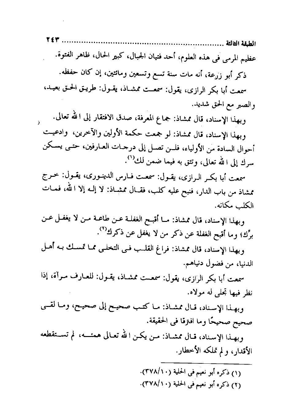 وَبِهَذَا الْإِسْنَاد قَالَ ممشاذ لَو جمعت حِكْمَة الْأَوَّلين والآخرين وادعيت أَحْوَال السَّادة من الْأَوْلِيَاء فَلَنْ تصل إِلَى دَرَجَات العارفين حَتَّى يسكن سرك إِلَى الله تَعَالَى وتثق بِهِ فِيمَا ضمن لَك