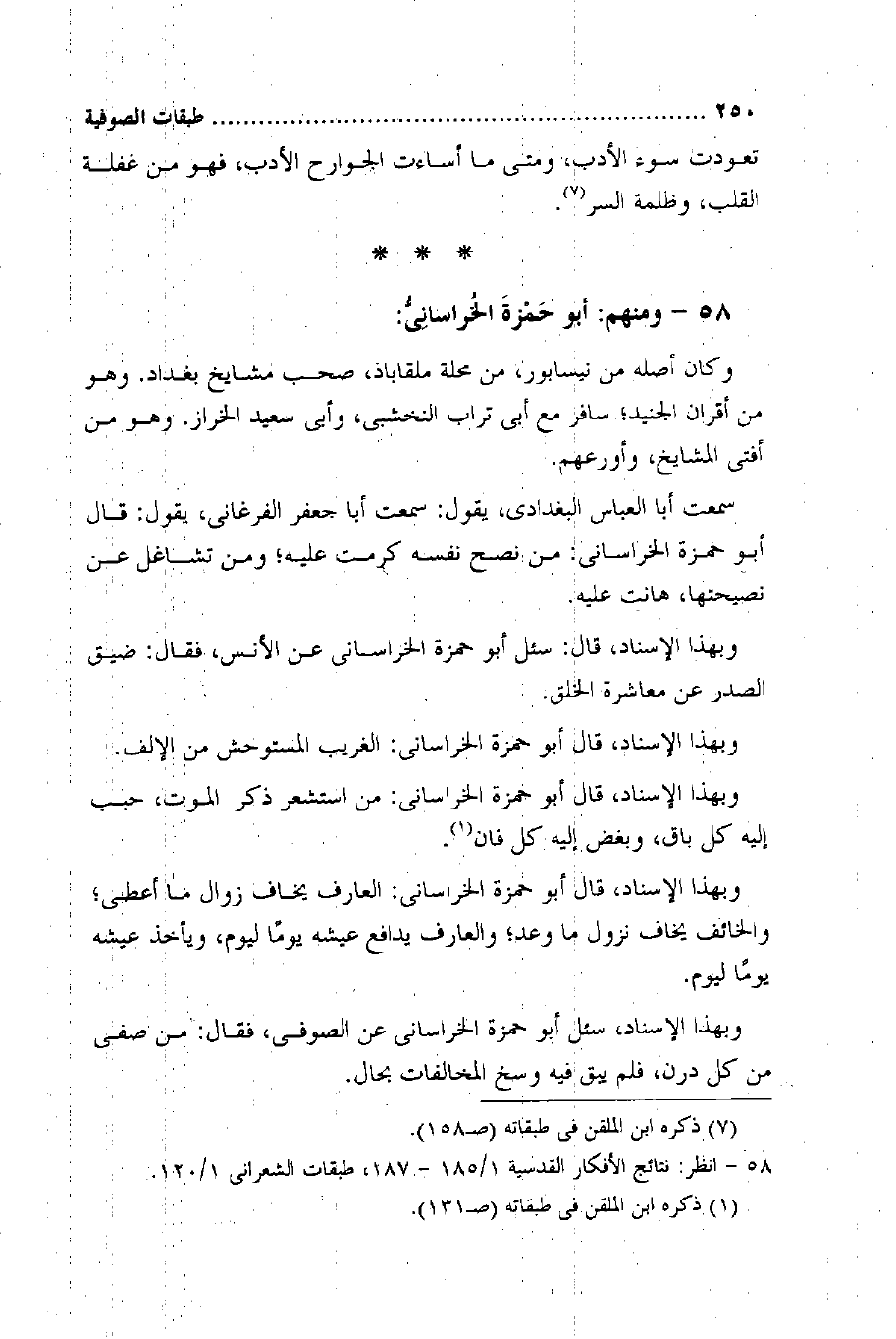 وَبِهَذَا الْإِسْنَاد سُئِلَ أَبُو حَمْزَة الْخُرَاسَانِي عَن الصُّوفِي فَقَالَ من صفى من كل درن فَلم يبْق فِيهِ وسخ المخالفات بِحَال