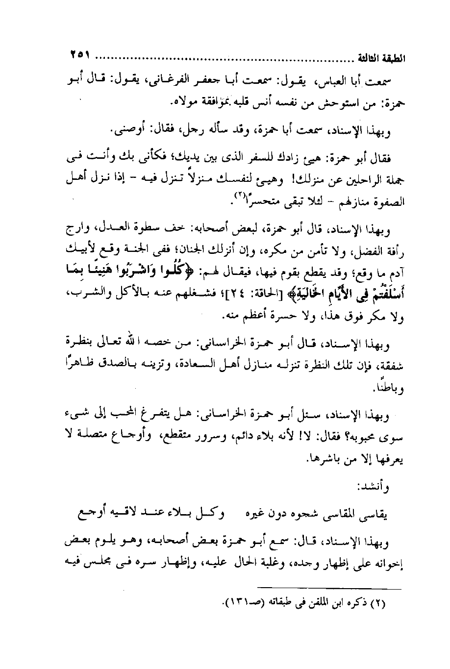 وَبِهَذَا الْإِسْنَاد قَالَ سمع أَبُو حَمْزَة بعض أَصْحَابه وَهُوَ يلوم بعض إخوانه على إِظْهَار وجده وَغَلَبَة الْحَال عَلَيْهِ وَإِظْهَار سره فِي مجْلِس فِيهِ