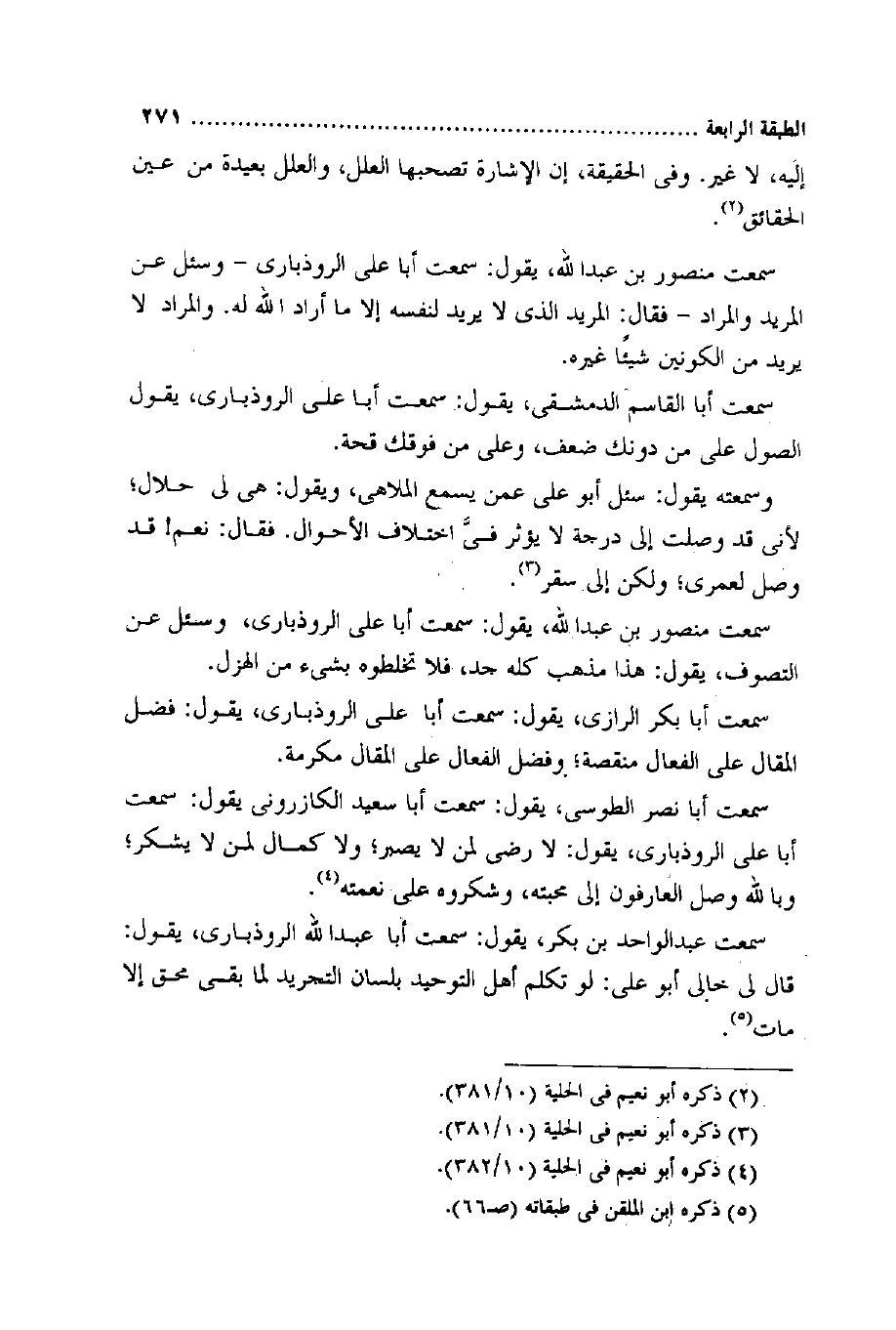 سَمِعت أَبَا نصر الطوسي يَقُول سَمِعت أَبَا سعيد الكازروني يَقُول سَمِعت أَبَا عَليّ الرُّوذَبَارِي يَقُول لَا رضى لمن لَا لَا يصبر وَلَا كَمَال لمن لَا يشْكر وَبِاللَّهِ وصل العارفون إِلَى محبته وشكروه على نعْمَته