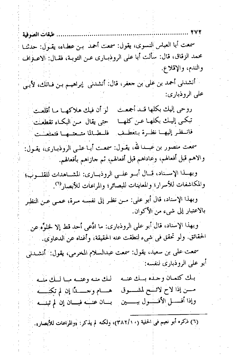 وَبِهَذَا الْإِسْنَاد قَالَ أَبُو عَليّ الرُّوذَبَارِي المشاهدات للقلوب والمكاشفات للأسرار والمعاينات للبصائر والمراعات للأبصار