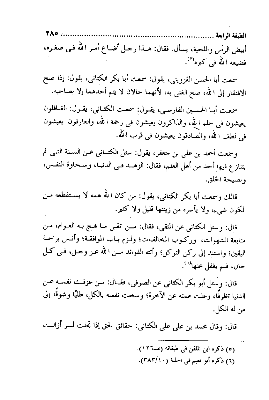 قَالَ وَسُئِلَ أَبُو بكر الكتاني عَن الصُّوفِي فَقَالَ من عزفت نَفسه عَن الدُّنْيَا تظرفا وعلت همته عَن الْآخِرَة وسخت نَفسه بِالْكُلِّ طلبا وشوقا إِلَى من لَهُ الْكل