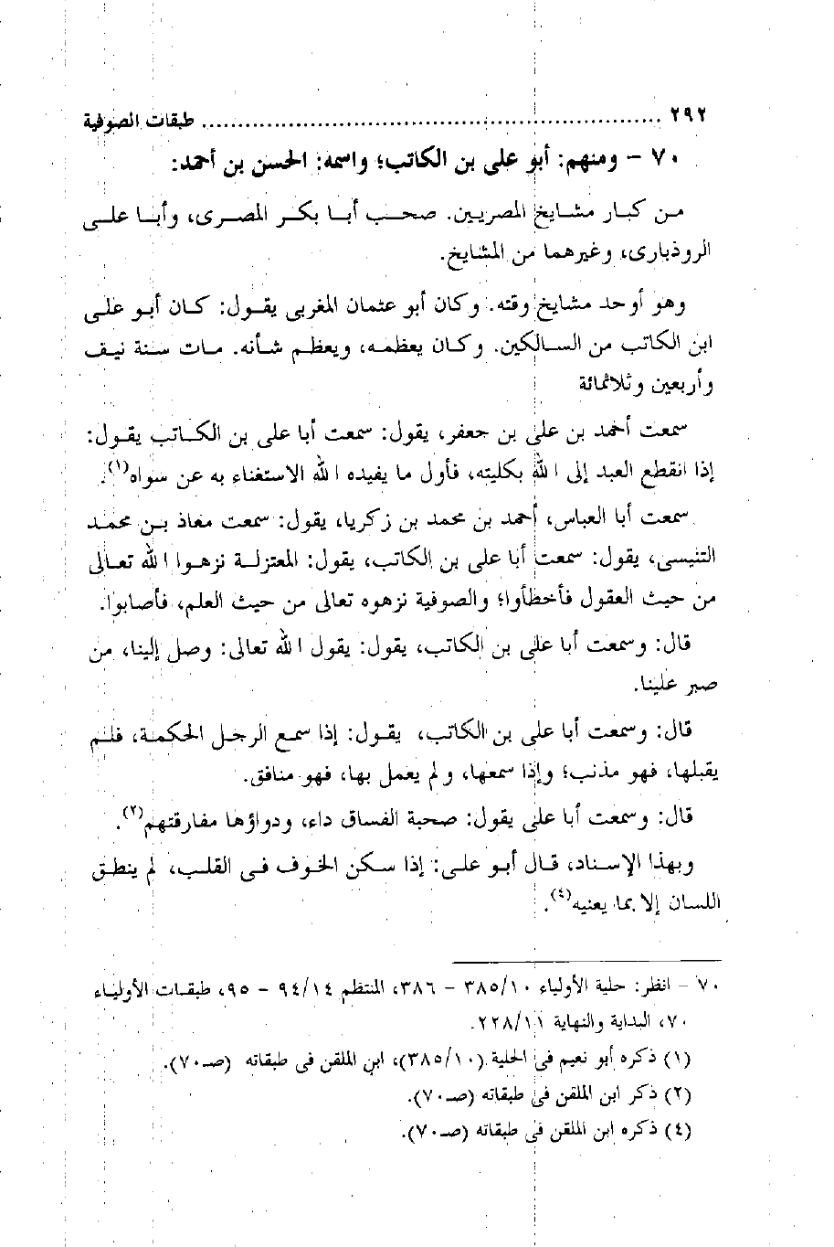 وَهُوَ أوحد مَشَايِخ وقته وَكَانَ أَبُو عُثْمَان المغربي يَقُول كَانَ أَبُو عَليّ ابْن الْكَاتِب من السالكين وَكَانَ يعظمه ويعظم شَأْنه مَاتَ سنة نَيف وَأَرْبَعين وثلاثمائة