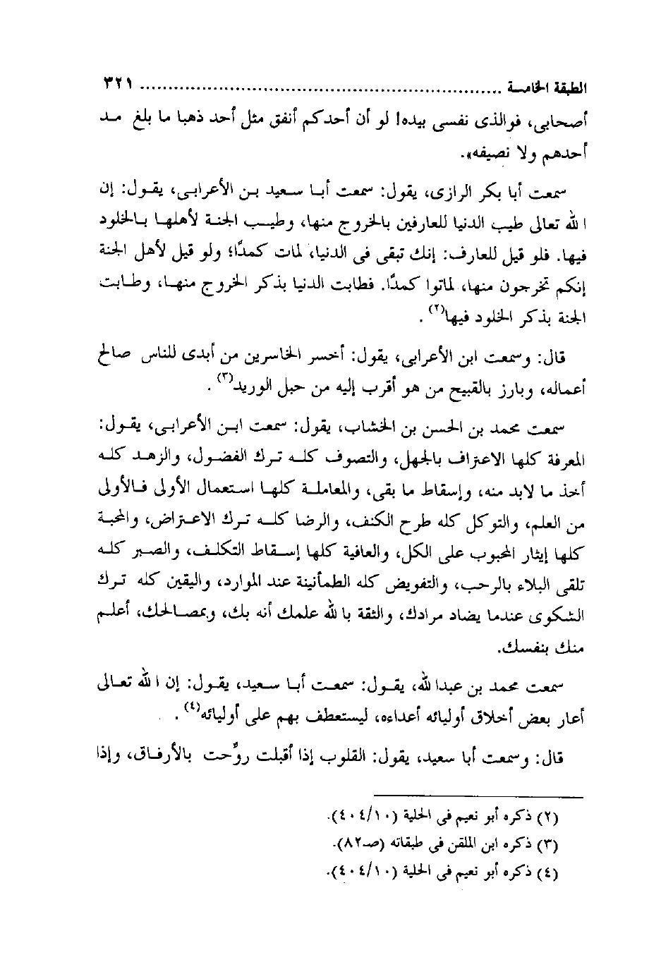 سَمِعت مُحَمَّد بن الْحسن بن الخشاب يَقُول سَمِعت ابْن الْأَعرَابِي يَقُول الْمعرفَة كلهَا الِاعْتِرَاف بِالْجَهْلِ والتصوف كُله ترك الفضول والزهد كُله أَخذ مَا لَا بُد مِنْهُ وَإِسْقَاط مَا بَقِي والمعاملة كلهَا اسْتِعْمَال الأولى فَالْأولى من الْعلم والتوكل كُله طرح الكنف وَالرِّضَا كُله ترك الِاعْتِرَاض والمحبة كلهَا إِيثَار المحبوب على الْكل والعافية كلهَا إِسْقَاط التَّكَلُّف وَالصَّبْر كُله تلقي الْبلَاء بالرحب والتفويض كُله الطُّمَأْنِينَة عِنْد الْمَوَارِد وَالْيَقِين كُله ترك الشكوى عِنْدَمَا يضاد مرادك والثقة بِاللَّه علمك أَنه بك وبمصالحك أعلم مِنْك بِنَفْسِك