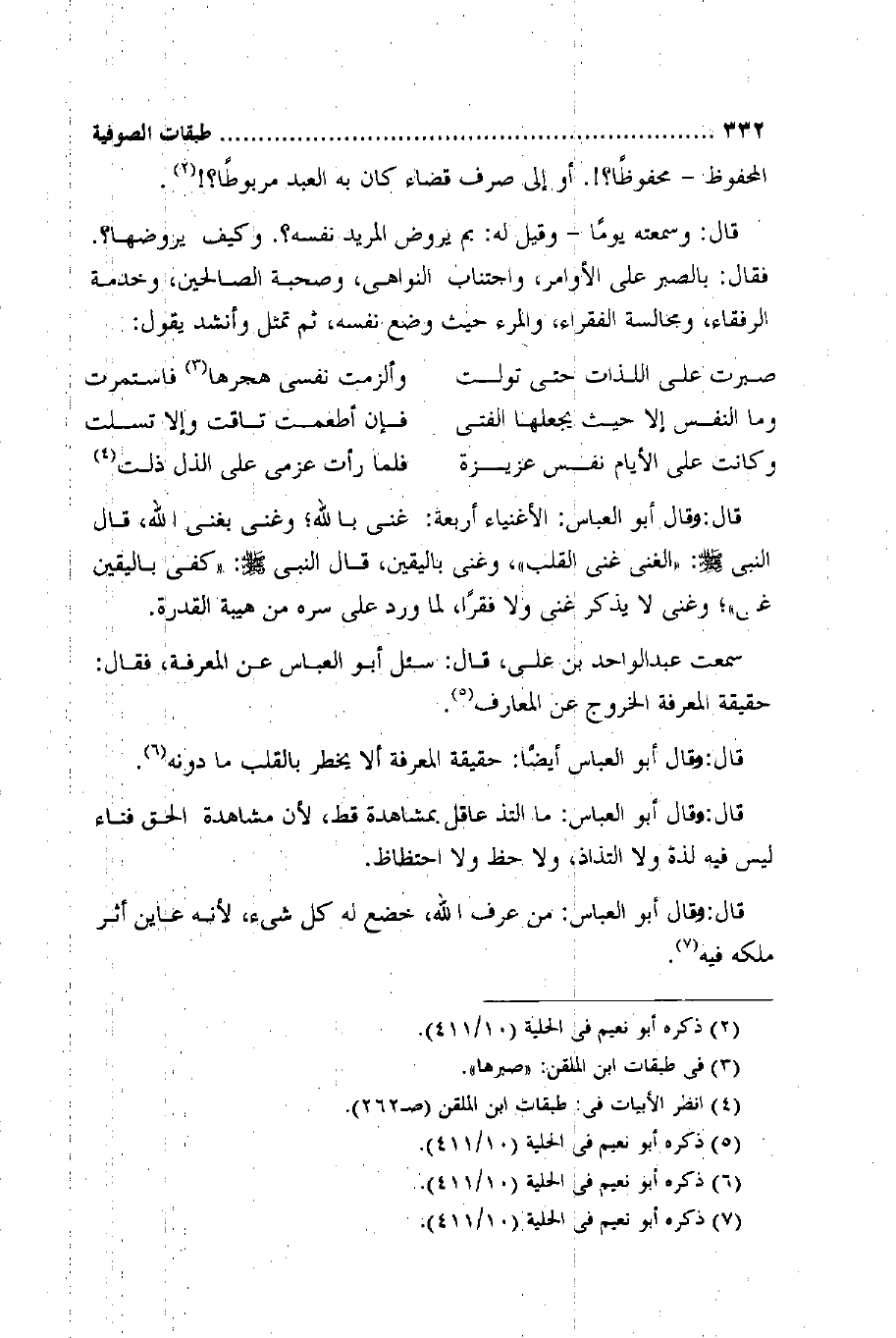قَالَ وَقَالَ أَبُو الْعَبَّاس الْأَغْنِيَاء أَرْبَعَة غَنِي بِاللَّه وغني بغنى الله قَالَ النَّبِي صلى الله عَلَيْهِ وَسلم (الْغَنِيّ غَنِي الْقلب) وغني بِالْيَقِينِ قَالَ النَّبِي صلى الله عَلَيْهِ وَسلم (كفى بِالْيَقِينِ غنى) وغني لَا يذكر غنى وَلَا فقرا لما ورد على سره من هَيْبَة الْقُدْرَة