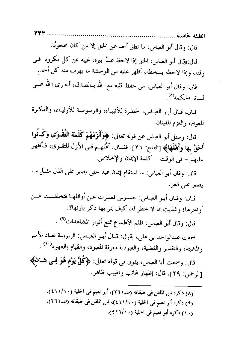 قَالَ وَسُئِلَ أَبُو الْعَبَّاس عَن قَوْله تَعَالَى {وألزمهم كلمة التَّقْوَى وَكَانُوا أَحَق بهَا وَأَهْلهَا} الْفَتْح 26 فَقَالَ أهلهم فِي الْأَزَل للتقوى فأظهر عَلَيْهِم فِي الْوَقْت كلمة الْإِيمَان وَالْإِخْلَاص