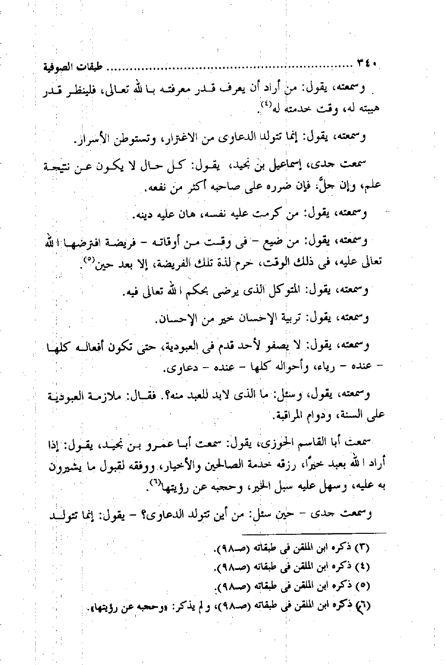 وسمعته يَقُول لَا يصفو لأحد قدم فِي الْعُبُودِيَّة حَتَّى تكون أَفعاله كلهَا عِنْده رِيَاء وأحواله كلهَا عِنْده دعاوى