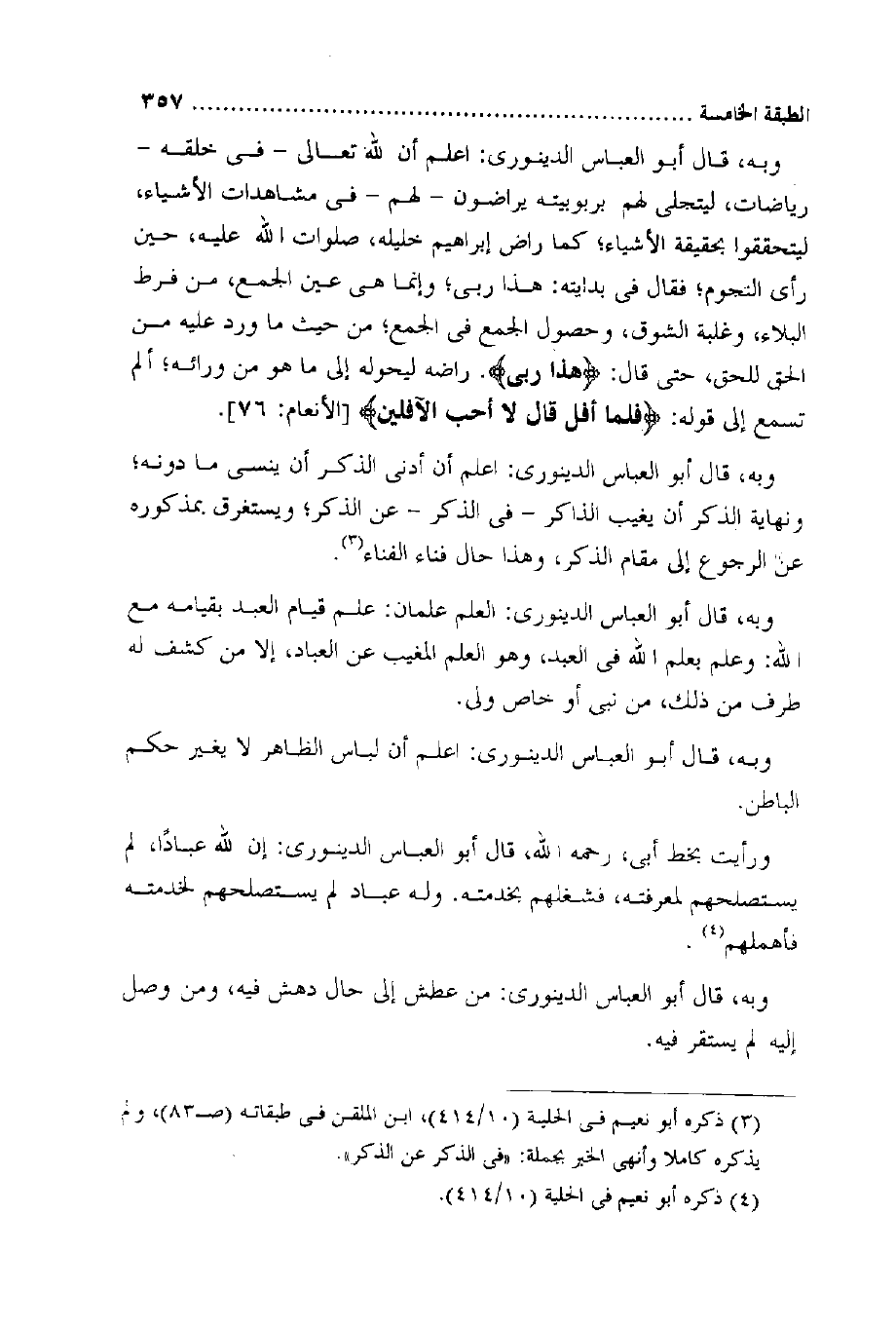 وَبِه قَالَ أَبُو الْعَبَّاس الدينَوَرِي اعْلَم أَن الله تَعَالَى فِي خلقه رياضات ليتجلى لَهُم بربوبيته يراضون لَهُم فِي مشاهدات الْأَشْيَاء ليتحققوا بِحَقِيقَة الْأَشْيَاء كَمَا رَاض إِبْرَاهِيم خَلِيله صلوَات الله عَلَيْهِ حِين رأى النُّجُوم فَقَالَ فِي بدايته هَذَا رَبِّي وَإِنَّمَا هِيَ عين الْجمع من فرط الْبلَاء وَغَلَبَة الشوق وَحُصُول الْجمع فِي الْجمع من حَيْثُ مَا ورد عَلَيْهِ من الْحق للحق حَتَّى قَالَ {هَذَا رَبِّي} راضه ليحوله إِلَى مَا هُوَ من وَرَائه ألم تسمع إِلَى قَوْله {فَلَمَّا أفل قَالَ لَا أحب الآفلين} الْأَنْعَام 76