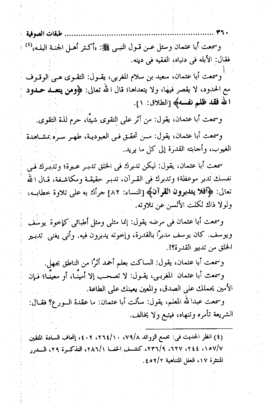 وَسمعت أَبَا عُثْمَان سعيد بن سَلام المغربي يَقُول التَّقْوَى هِيَ الْوُقُوف مَعَ الْحُدُود لَا يقصر فِيهَا وَلَا يتعداها قَالَ الله تَعَالَى {وَمن يَتَعَدَّ حُدُود الله فقد ظلم نَفسه} الطَّلَاق 1