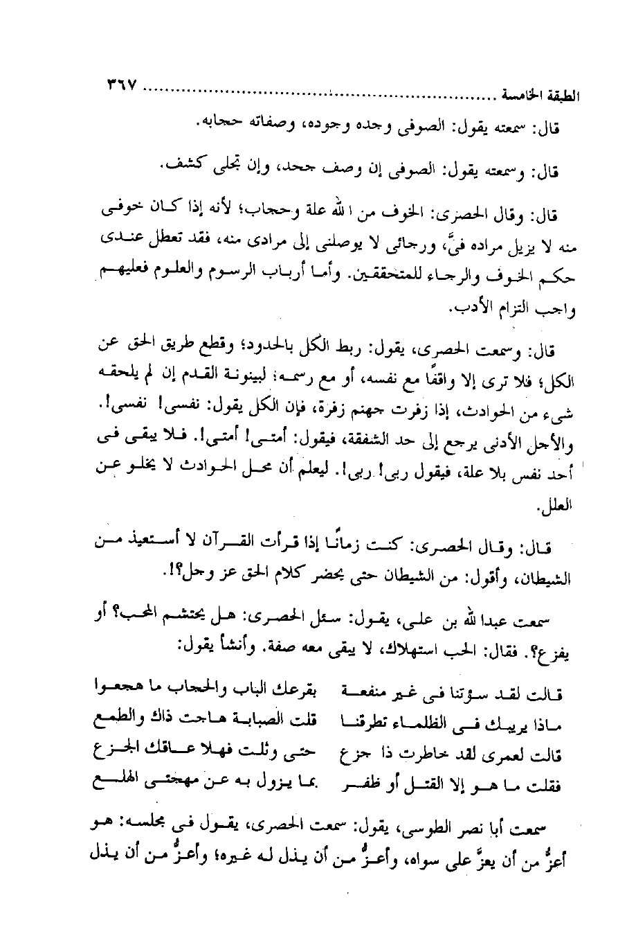 قَالَ وَسمعت الحصري يَقُول ربط الْكل بالحدود وَقطع طَرِيق الْحق عَن الْكل فَلَا ترى إِلَّا وَاقِفًا مَعَ نَفسه أَو مَعَ رسمه لبينونة الْقدَم إِن لم يلْحقهُ شَيْء من الْحَوَادِث إِذا زفرت جَهَنَّم زفرَة فَإِن الْكل يَقُول نَفسِي نَفسِي وَالْأَجَل الْأَدْنَى يرجع إِلَى حد الشَّفَقَة فَيَقُول أمتِي أمتِي فَلَا يبْقى فِي أحد نفس بِلَا عِلّة فَيَقُول رَبِّي رَبِّي ليعلم أَن مَحل الْحَوَادِث لَا يَخْلُو عَن الْعِلَل