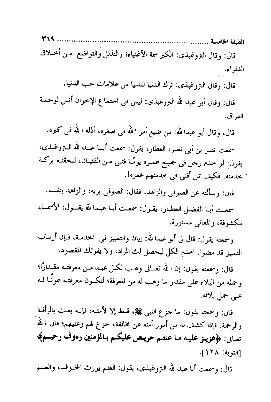 سَمِعت نصر بن أبي نصر الْعَطَّار يَقُول سَمِعت أَبَا عبد الله التروغبذي يَقُول لَو خدم رجل فِي جَمِيع عمره يَوْمًا فَتى من الفتيان للحقته بركَة خدمته فَكيف بِمن أفنى فِي خدمتهم عمره