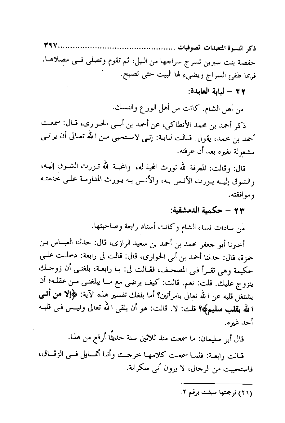 أخبرنَا أَبُو جَعْفَر مُحَمَّد بن أَحْمد بن سعيد الرَّازِيّ قَالَ حَدثنَا الْعَبَّاس بن حَمْزَة قَالَ حَدثنَا أَحْمد بن أبي الْحوَاري قَالَ قَالَت لي رَابِعَة دخلت على حكيمة وَهِي تقْرَأ فِي الْمُصحف فَقَالَت لي يَا رَابِعَة بَلغنِي أَن زَوجك يتَزَوَّج عَلَيْك قلت نعم قَالَت كَيفَ يرضى مَعَ مَا يبلغنِي من عقله أَن يشْتَغل قلبه عَن الله تَعَالَى بامرأتين أما بلغك تَفْسِير هَذِه الْآيَة {إِلَّا من أَتَى الله بقلب سليم} قلت لَا قَالَت هُوَ أَن يلقى الله تَعَالَى وَلَيْسَ فِي قلبه أحد غَيره