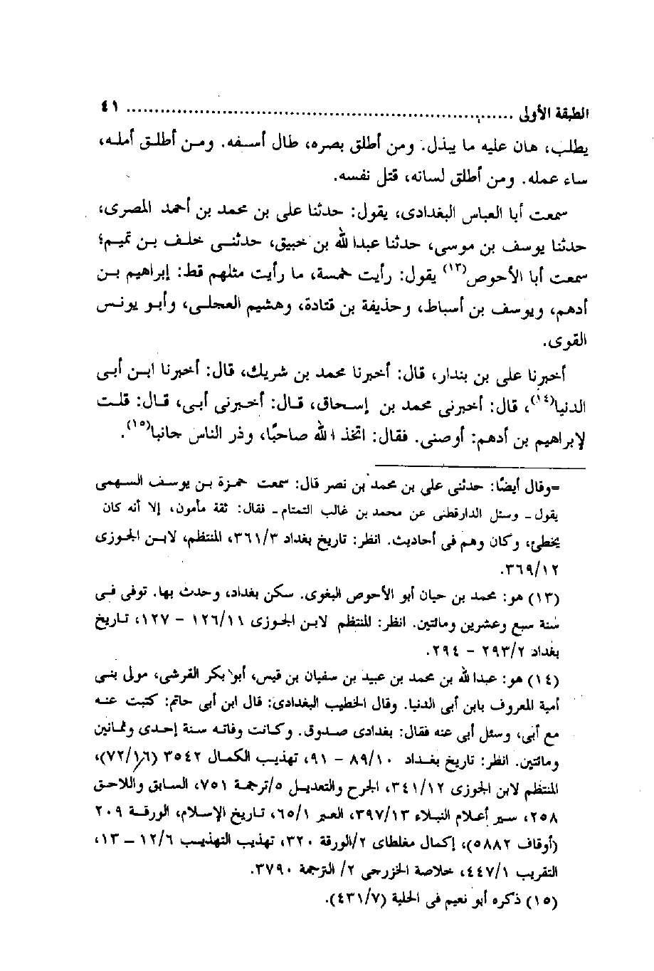 سَمِعت أَبَا الْعَبَّاس الْبَغْدَادِيّ يَقُول حَدثنَا عَليّ بن مُحَمَّد بن أَحْمد الْمصْرِيّ حَدثنَا يُوسُف بن مُوسَى حَدثنَا عبد الله بن خبيق حَدثنِي خلف بن تَمِيم سَمِعت أَبَا الْأَحْوَص يَقُول رَأَيْت خَمْسَة مَا رَأَيْت مثلهم قطّ إِبْرَاهِيم بن أدهم ويوسف بن أَسْبَاط وَحُذَيْفَة بن قَتَادَة وهشيم الْعجلِيّ وَأَبُو يُونُس الْقوي