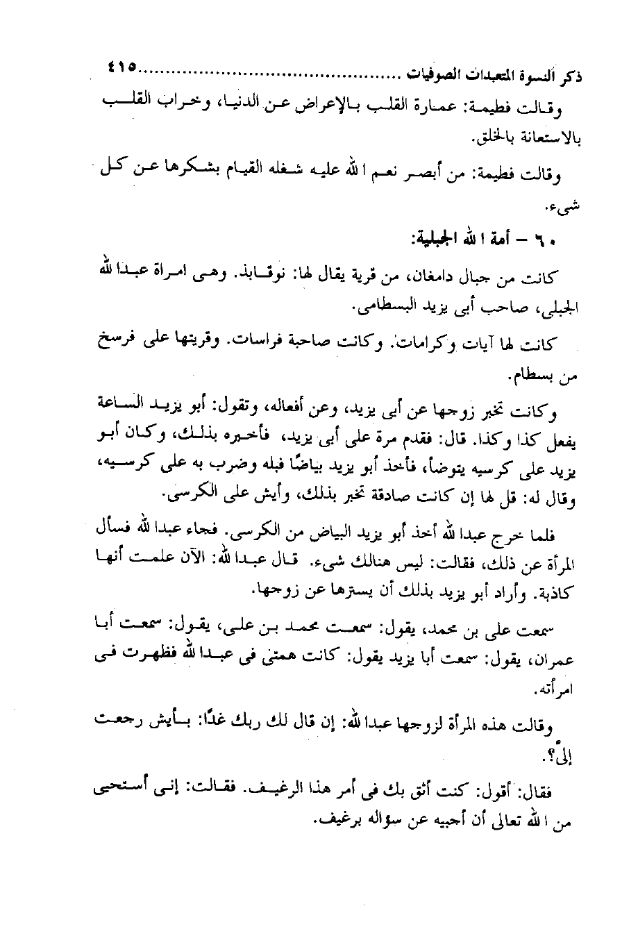 سَمِعت عَليّ بن مُحَمَّد يَقُول سَمِعت مُحَمَّد بن عَليّ يَقُول سَمِعت أَبَا عمرَان يَقُول سَمِعت أَبَا يزِيد يَقُول كَانَت همتي فِي عبد الله فظهرت فِي امْرَأَته امْرَأَته