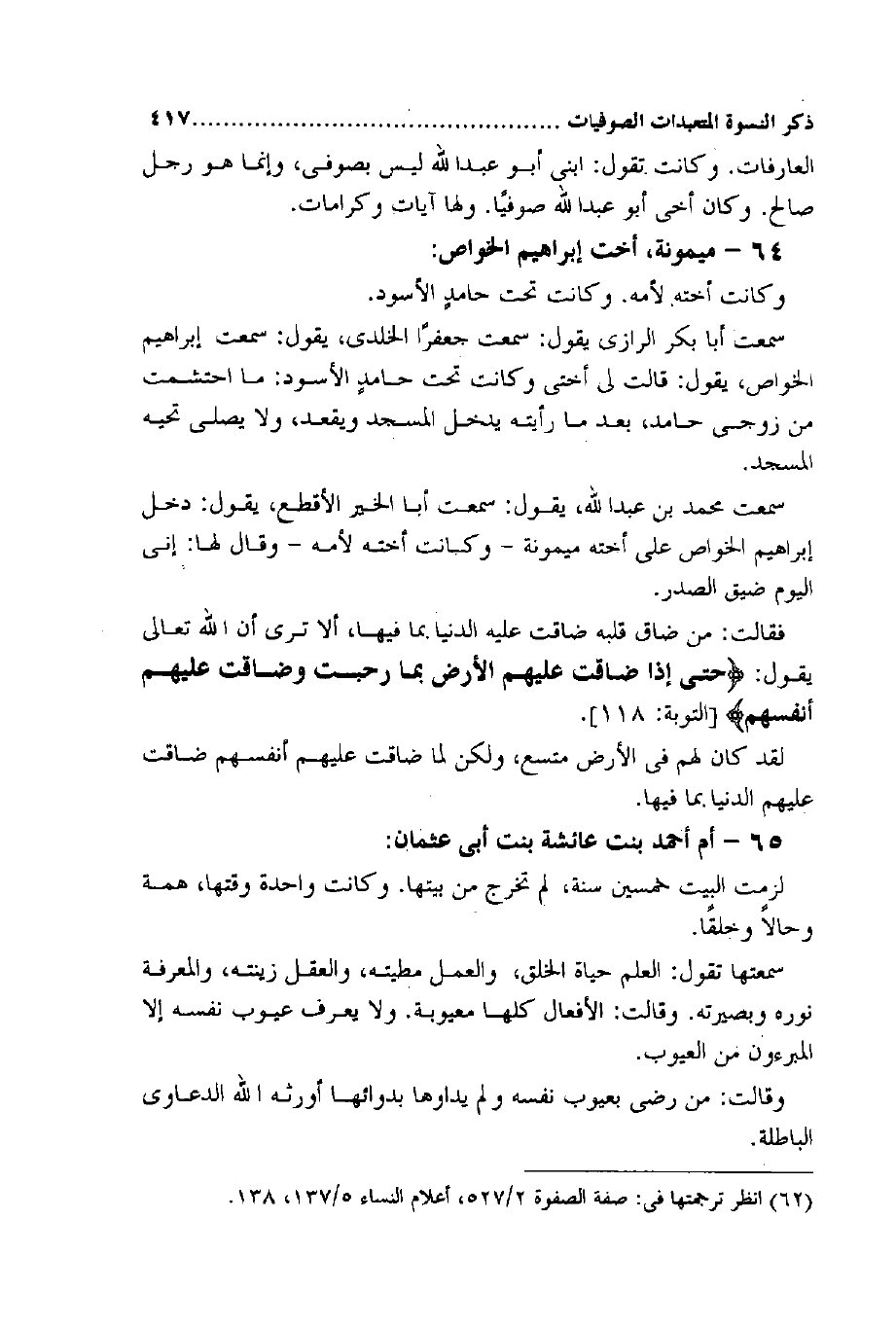 العارفات وَكَانَت تَقول ابْني أَبُو عبد الله لَيْسَ بصوفي وَإِنَّمَا هُوَ رجل صَالح وَكَانَ أخي أَبُو عبد الله صوفيا وَلها آيَات وكرامات