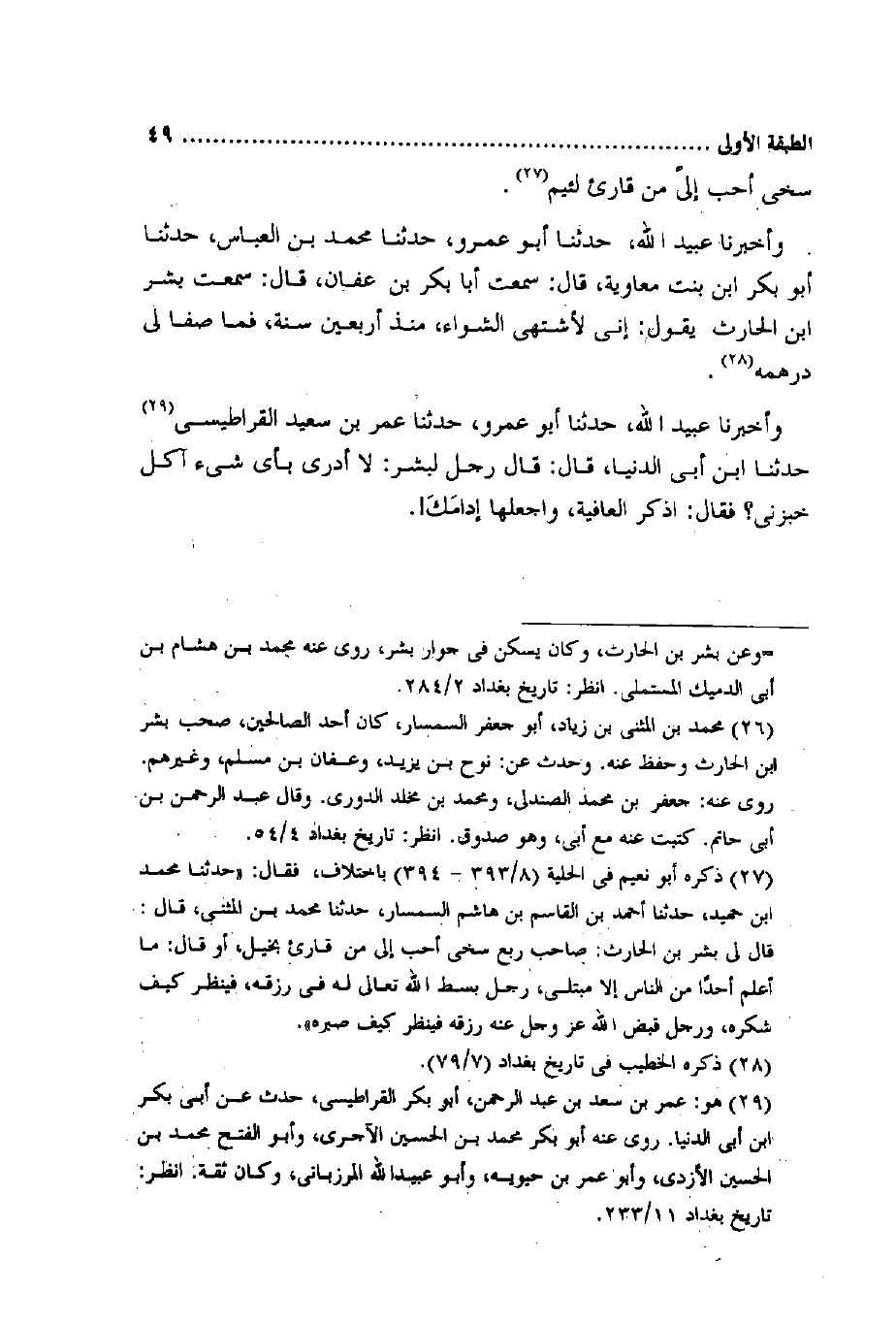 وَأخْبرنَا عبيد الله حَدثنَا أَبُو عَمْرو حَدثنَا مُحَمَّد بن الْعَبَّاس حَدثنَا أَبُو بكر ابْن بنت مُعَاوِيَة قَالَ سَمِعت أَبَا بكر بن عَفَّان قَالَ سَمِعت بشر ابْن الْحَارِث يَقُول إِنِّي لأشتهي الشواء مُنْذُ أَرْبَعِينَ سنة فَمَا صفا لي درهمه