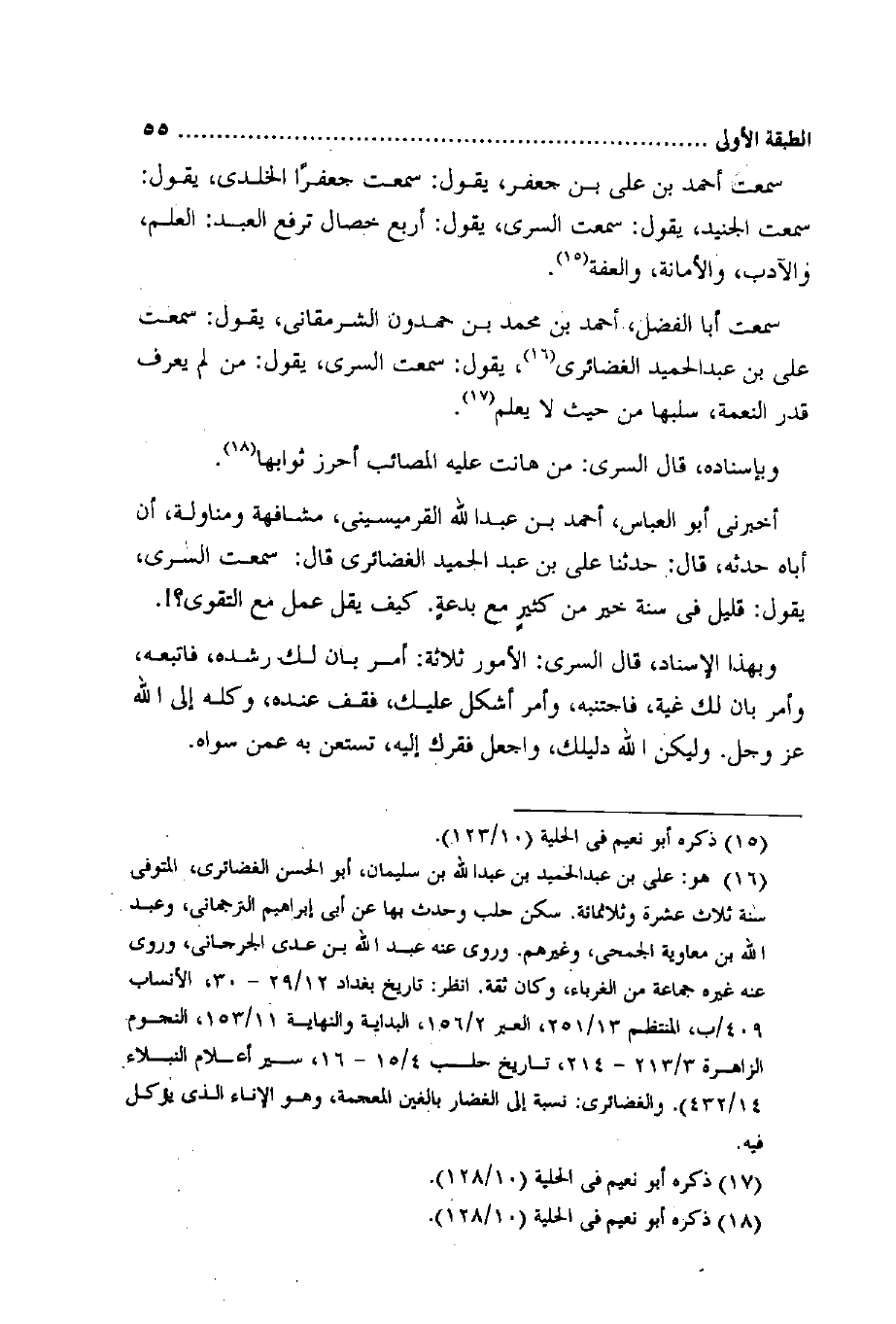 سَمِعت أَحْمد بن عَليّ بن جَعْفَر يَقُول سَمِعت جعفرا الْخُلْدِيِّ يَقُول سَمِعت الْجُنَيْد يَقُول سَمِعت السّري يَقُول أَربع خِصَال ترفع العَبْد الْعلم وَالْأَدب وَالْأَمَانَة والعفة