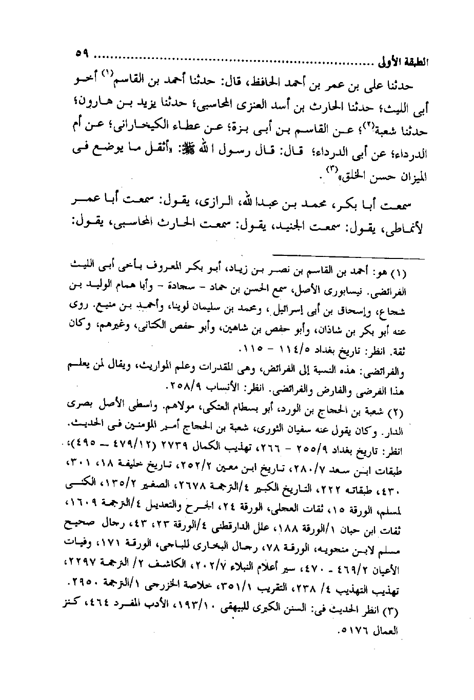 حَدثنَا عَليّ بن عمر بن أَحْمد الْحَافِظ قَالَ حَدثنَا أَحْمد بن الْقَاسِم أَخُو أبي اللَّيْث حَدثنَا الْحَارِث بن أَسد الْعَنزي المحاسبي حَدثنَا يزِيد بن هَارُون حَدثنَا شُعْبَة عَن الْقَاسِم بن أبي بزَّة عَن عَطاء الكيخاراني عَن أم الدَّرْدَاء عَن أبي الدَّرْدَاء قَالَ قَالَ رَسُول الله صلى الله عَلَيْهِ وَسلم (أثقل مَا يوضع فِي الْمِيزَان حسن الْخلق