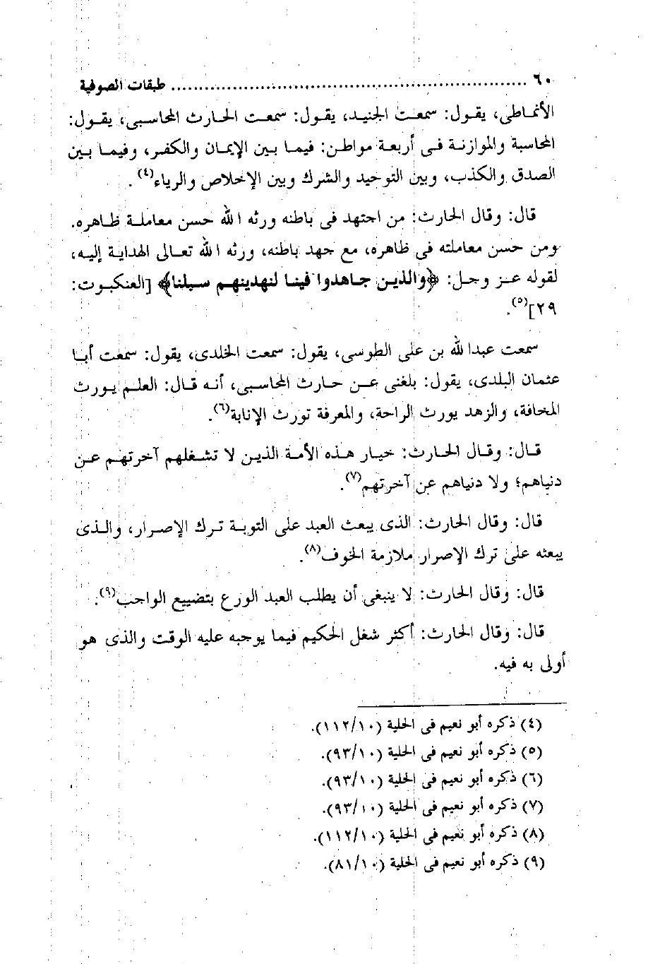 الْأنمَاطِي يَقُول سَمِعت الْجُنَيْد يَقُول سَمِعت الْحَارِث المحاسبي يَقُول المحاسبة والموازنة فِي أَرْبَعَة مَوَاطِن فِيمَا بَين الْإِيمَان وَالْكفْر وَفِيمَا بَين الصدْق وَالْكذب وَبَين التَّوْحِيد والشرك وَبَين الْإِخْلَاص والرياء