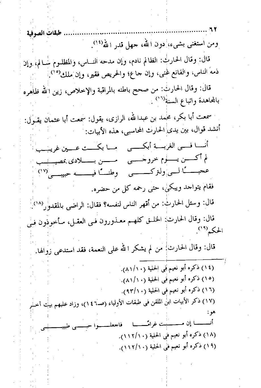 سَمِعت أَبَا بكر مُحَمَّد بن عبد الله الرَّازِيّ يَقُول سَمِعت أَبَا عُثْمَان يَقُول أنْشد قَوَّال بَين يَدي الْحَارِث المحاسبي هَذِه الأبيات