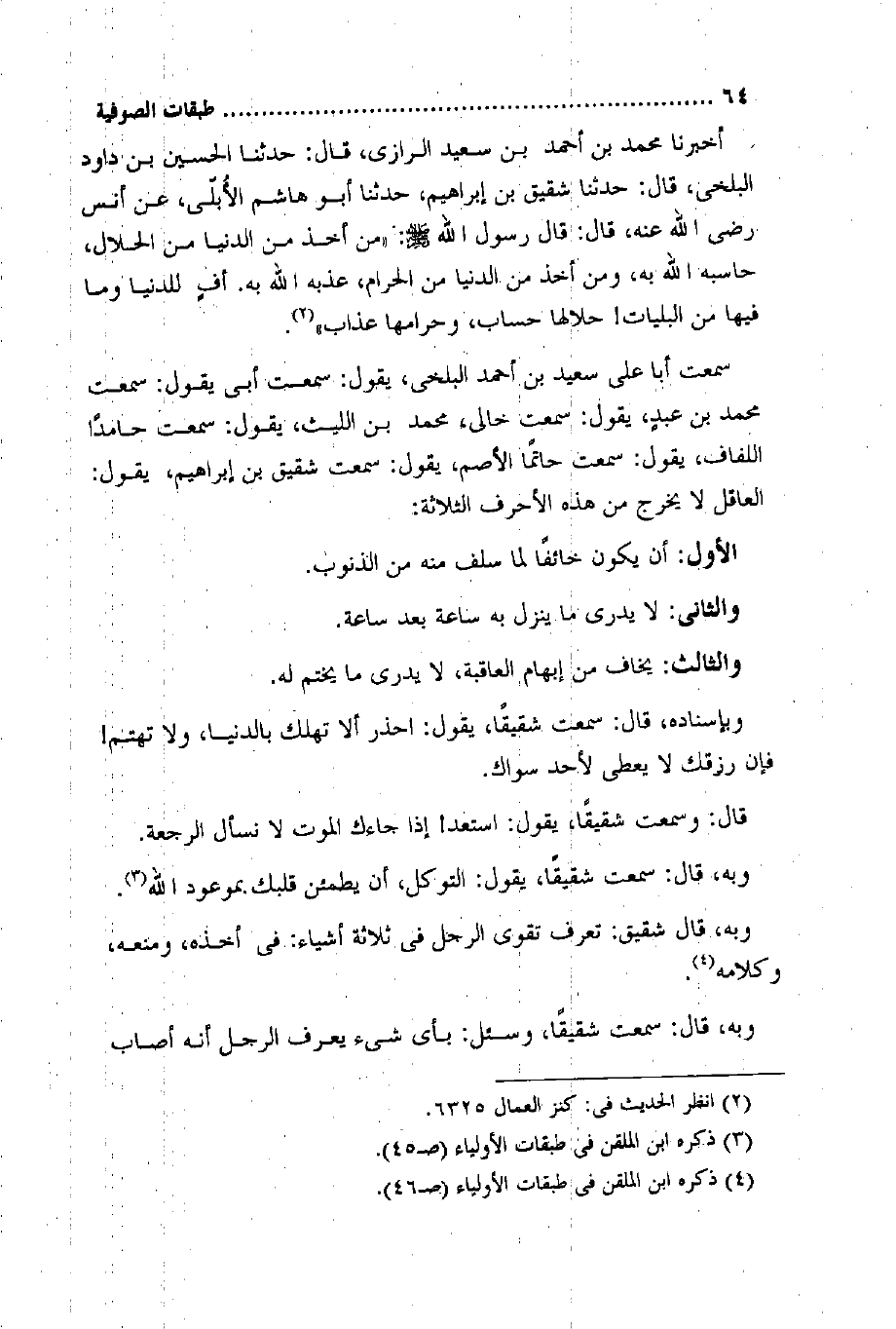 سَمِعت أَبَا عَليّ سعيد بن أَحْمد الْبَلْخِي يَقُول سَمِعت أبي يَقُول سَمِعت مُحَمَّد بن عبد يَقُول سَمِعت خَالِي مُحَمَّد بن اللَّيْث يَقُول سَمِعت حامدا اللفاف يَقُول سَمِعت حاتما الْأَصَم يَقُول سَمِعت شَقِيق بن إِبْرَاهِيم يَقُول الْعَاقِل لَا يخرج من هَذِه الأحرف الثَّلَاثَة