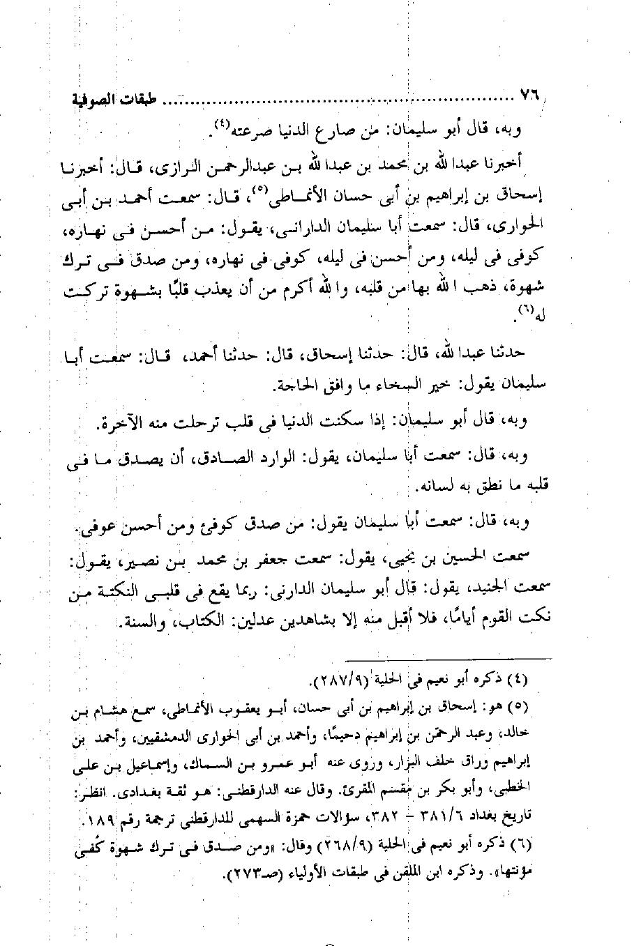 سَمِعت الْحُسَيْن بن يحيى يَقُول سَمِعت جَعْفَر بن مُحَمَّد بن نصير يَقُول سَمِعت الْجُنَيْد يَقُول قَالَ أَبُو سُلَيْمَان الدَّارَانِي رُبمَا يَقع فِي قلبِي النُّكْتَة من نكت الْقَوْم أَيَّامًا فَلَا أقبل مِنْهُ إِلَّا بِشَاهِدين عَدْلَيْنِ الْكتاب وَالسّنة